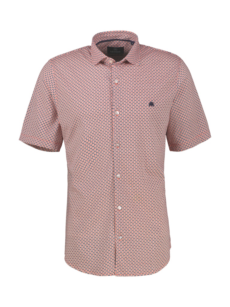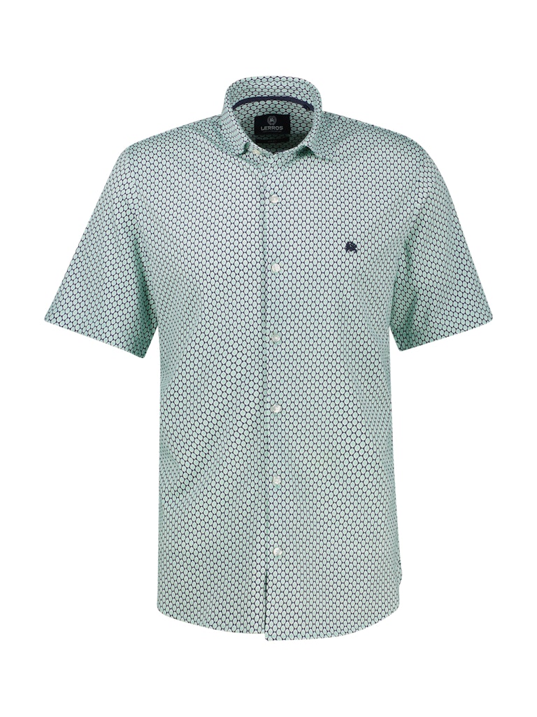 Overhemd van Lerros in een subtiel dessin met korte mouwen, kent kraag, knoopsluiting en een geborduurd logo op de linkerborst.