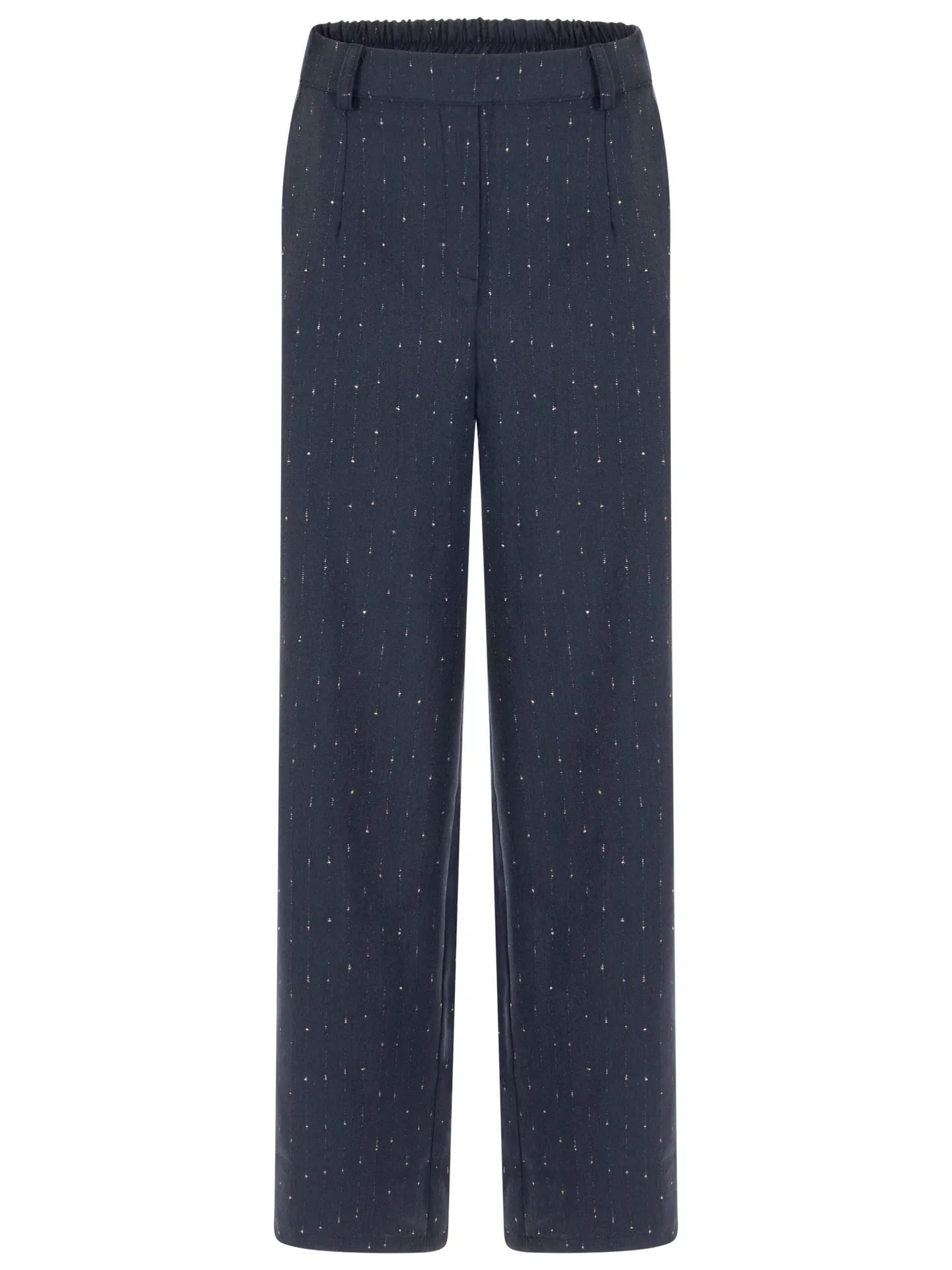 Broek van SAAR met een ingeweven glansdraad, elastische tailleband, riemlussen, steekzakken en paspelzakken aan de achterzijde.