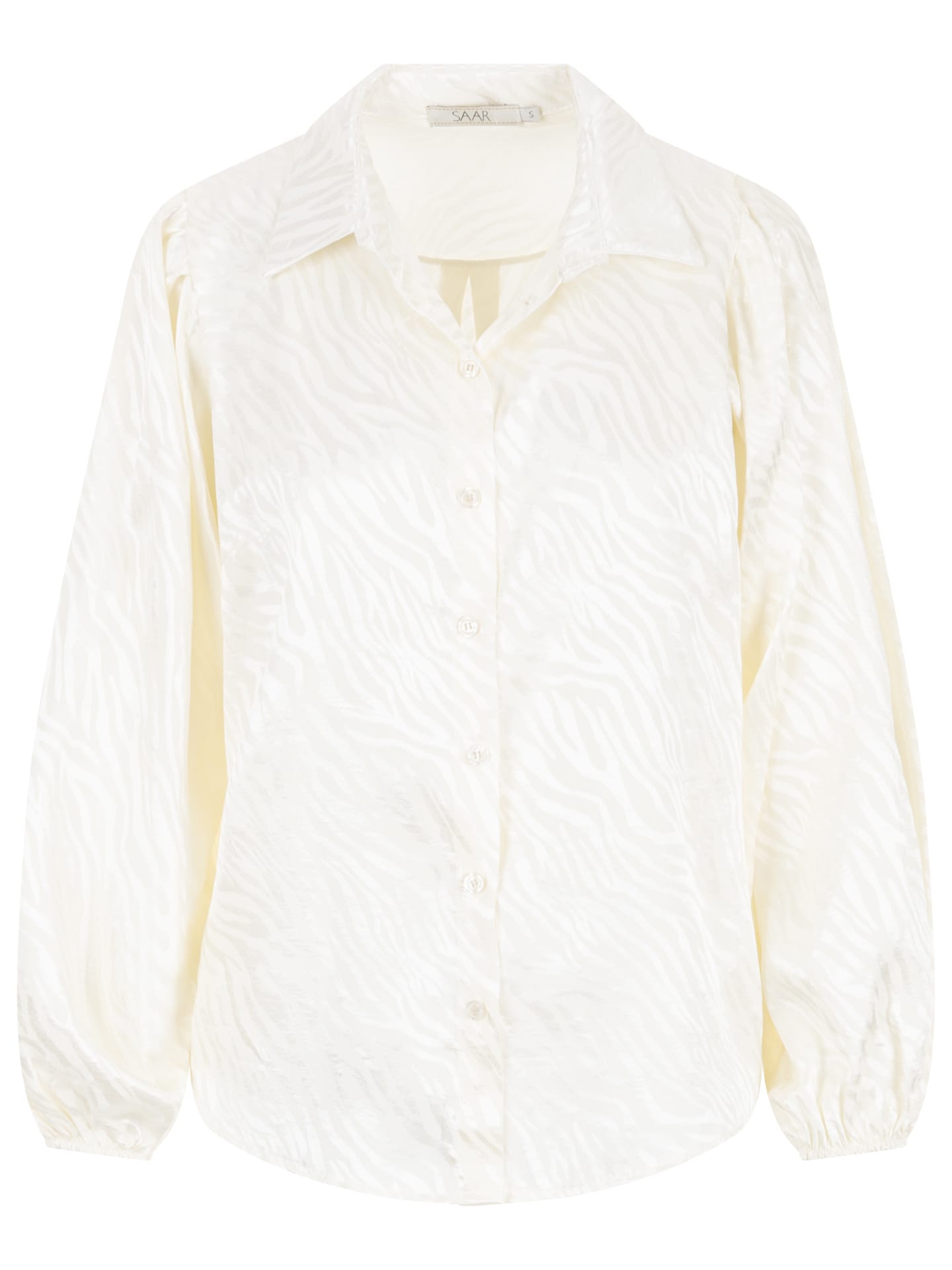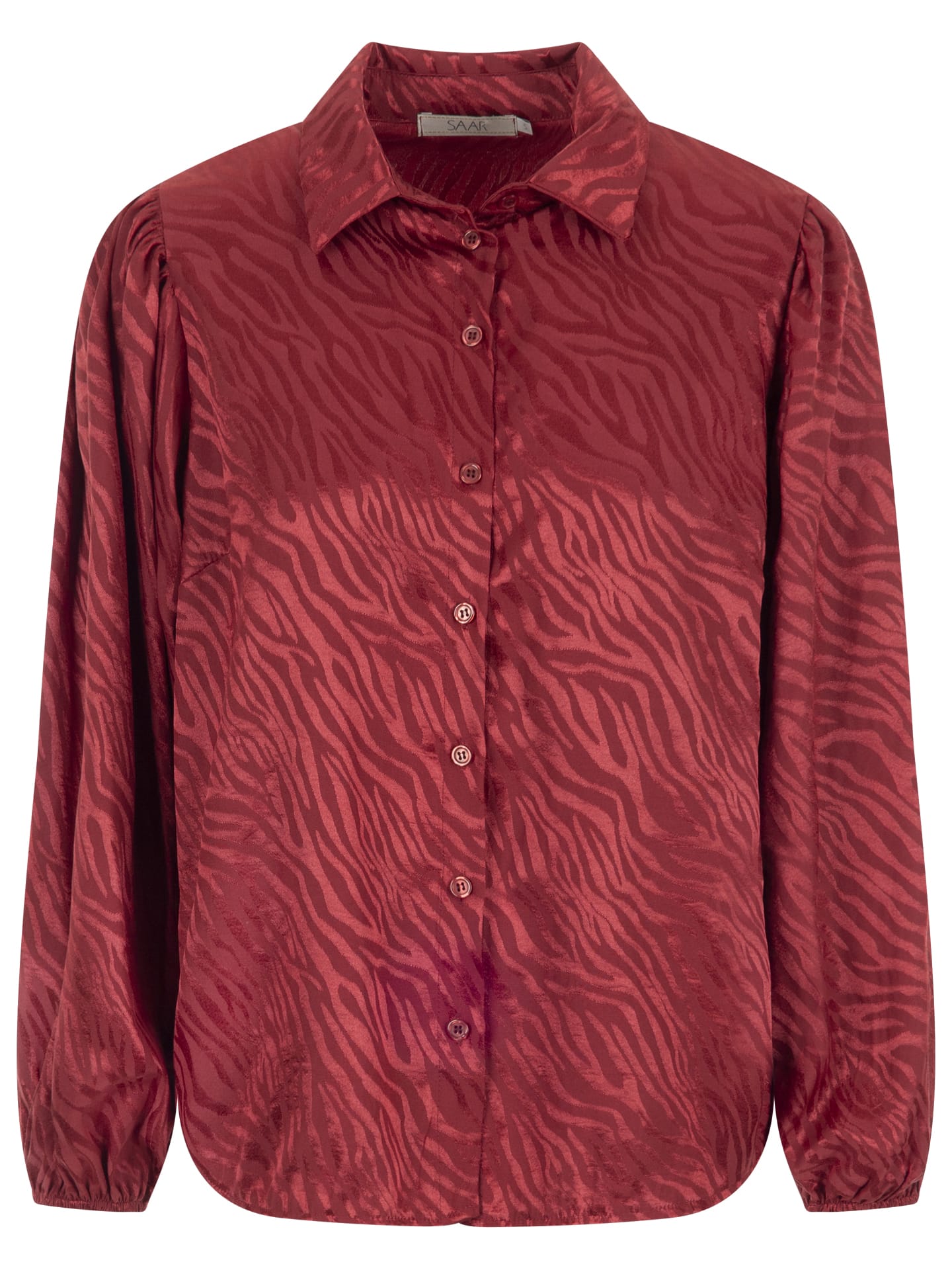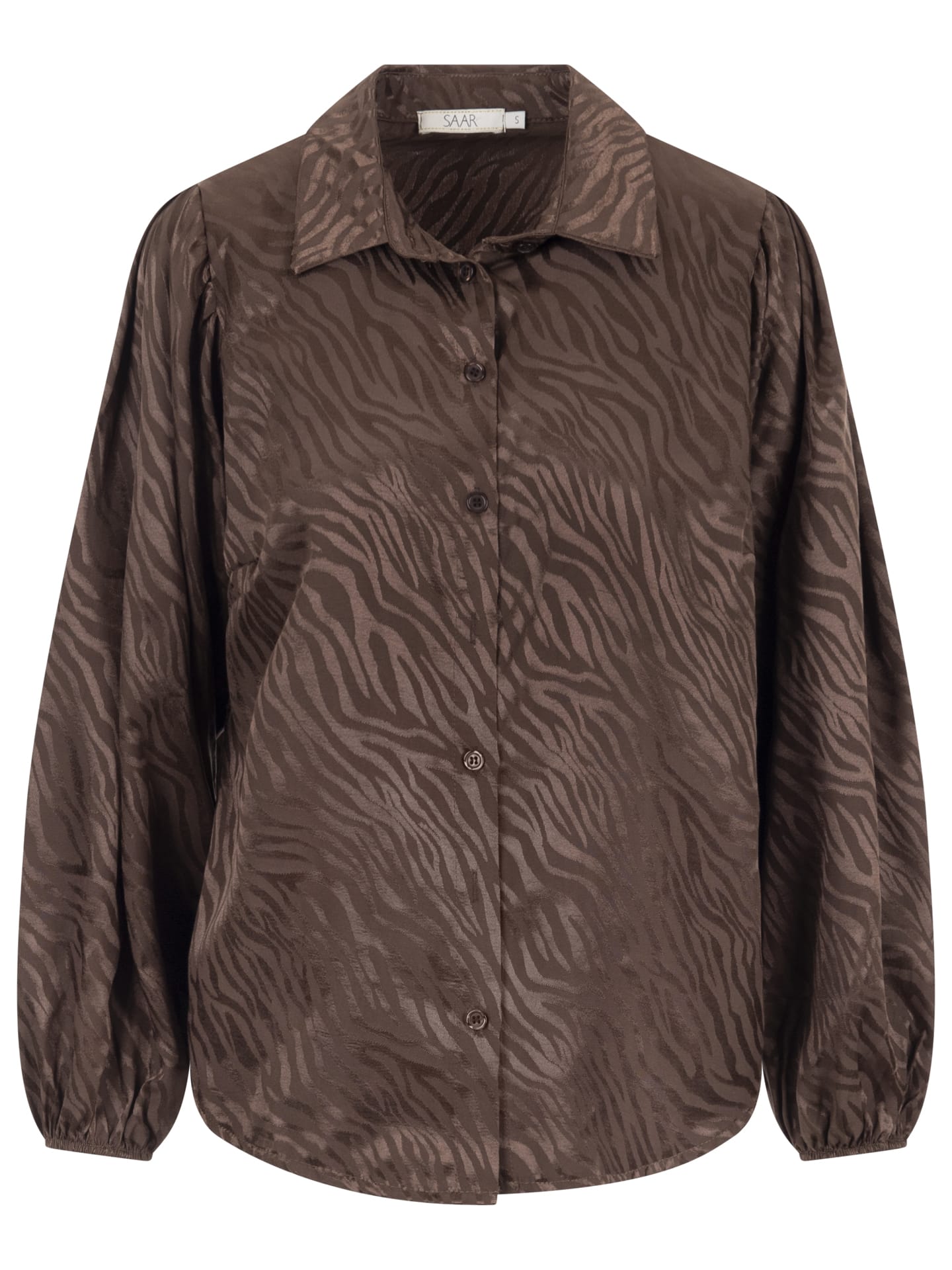 Glanzende blouse van SAAR in een all-over dessin met lange mouwen voorzien van elastische boorden, klassieke kraag en knoopsluiting. Materiaal: Viscose 59%| polyester 41%