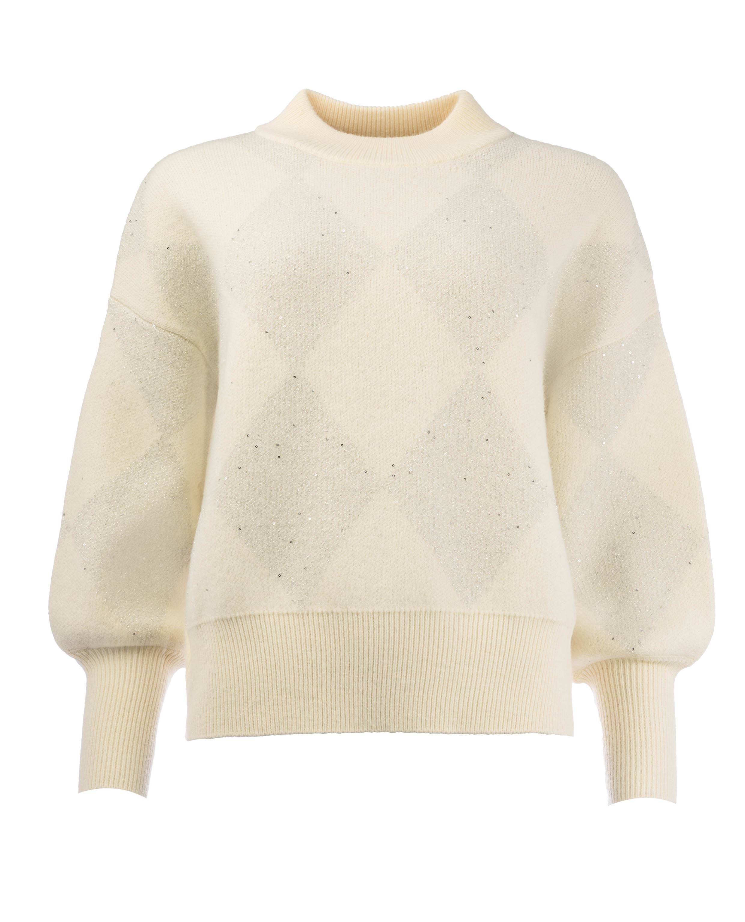 Trui van INCK voorzien van een lurex Argyle dessin met lange pofmouwen voorzien van brede manchetten, opstaande kraag en ribgebreide boorden. Materiaal: Polyester 42%| acryl 35%| polyamide 23%