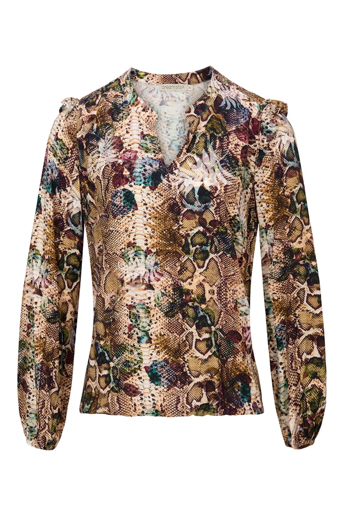 Blouse van Dreamstar in een all-over dessin met lange pofmouwen, ruche aan de schouders, V-hals en een elastische zoom. Materiaal: Viscose 100%