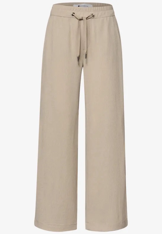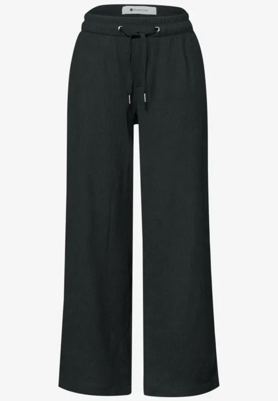 Broek van Street One in een structuur dessin met wijde pijpen, steekzakken, twee paspelzakken aan de achterzijde en een elastische tailleband voorzien van trekkoord. Materiaal: Polyester 59%| viscose 40%| elastan 1%