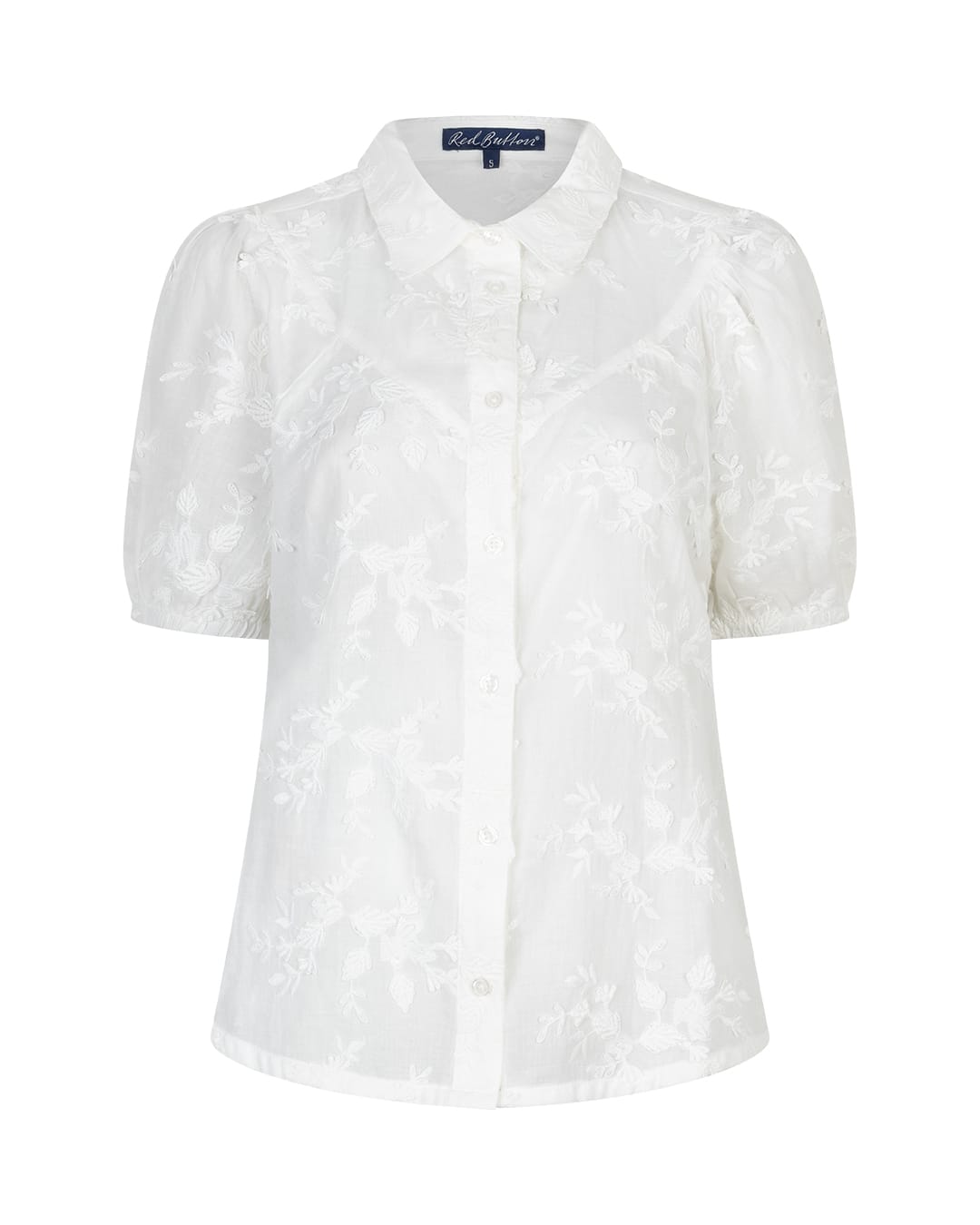 Blouse van Red Button met 3D geborduurde bloemen, korte pofmouwen, kraag en een knoopsluiting. Materiaal: Katoen 85%| polyester 15%