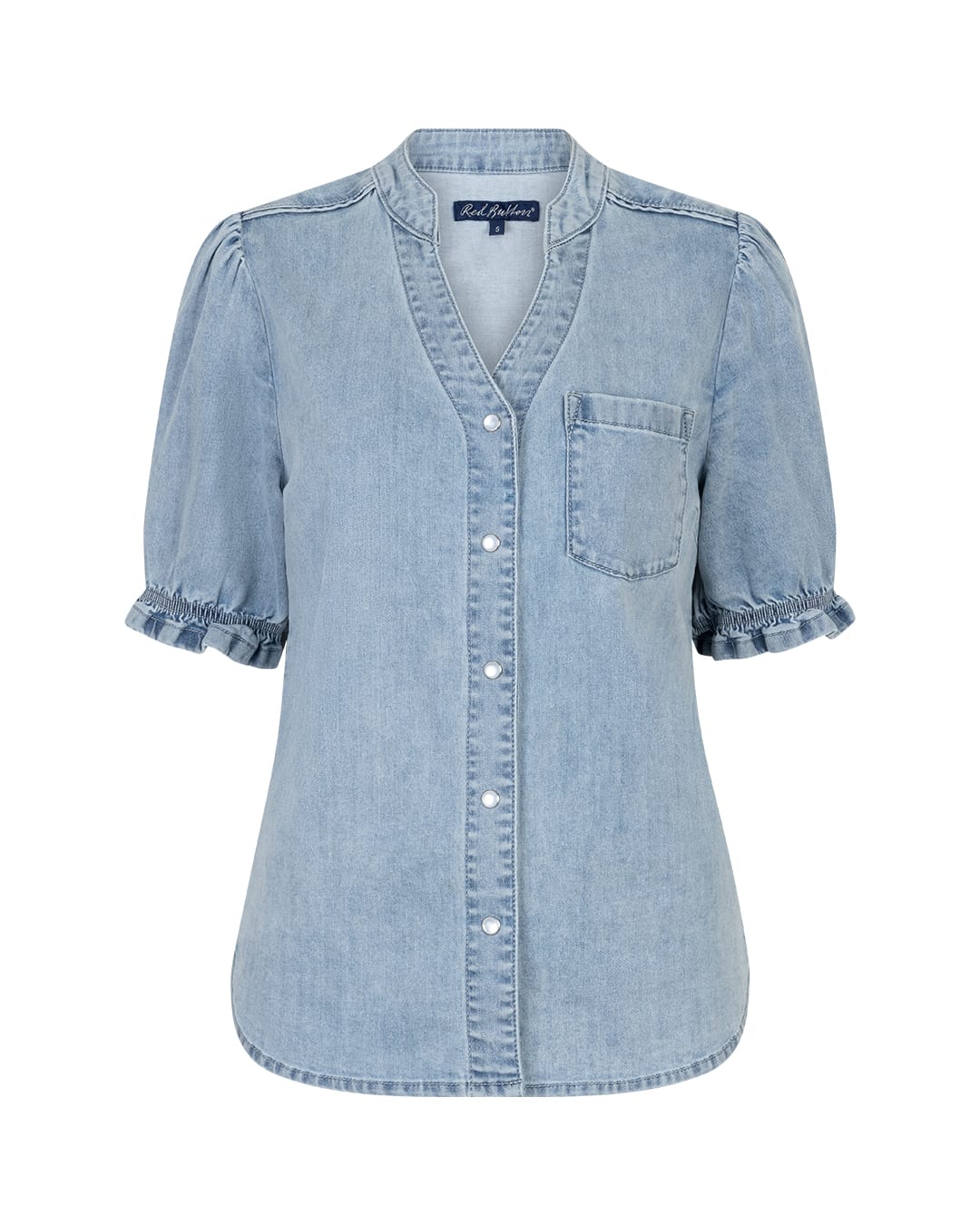 Denim blouse van Red Button met korte pofmouwen, opstaande kraag, V-hals, drukknoopsluiting, een opgestikte borstzak en een afgeronde zoom. Materiaal: Katoen 90%| polyester 9%| elastan 1%
