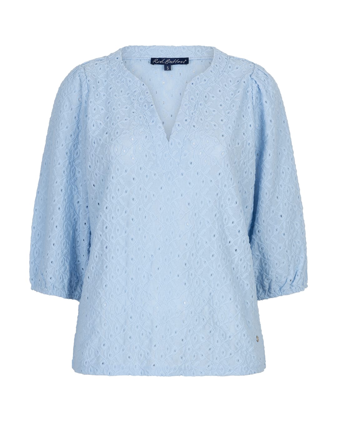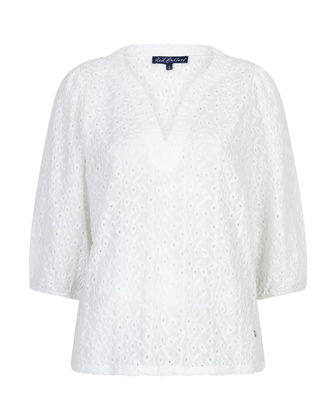 Broderie top van Red Button met driekwart ballonmouwen voorzien van elastische boorden en een V-hals. Materiaal: Polyester 95%| elastan 5%
