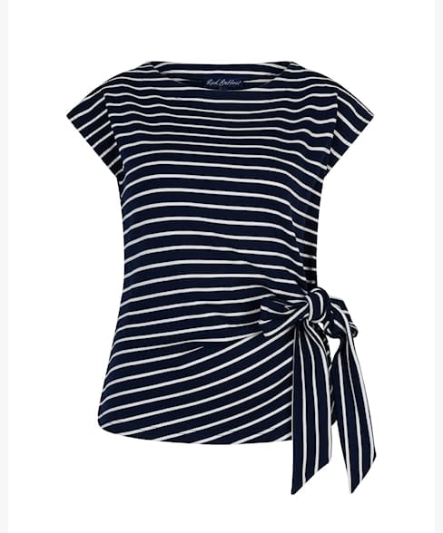 Gestreepte top van Red Button met aangeknipte mouwen, ronde hals en strikdetail in de taille. Materiaal: BCI katoen 97%| elastan 3%
