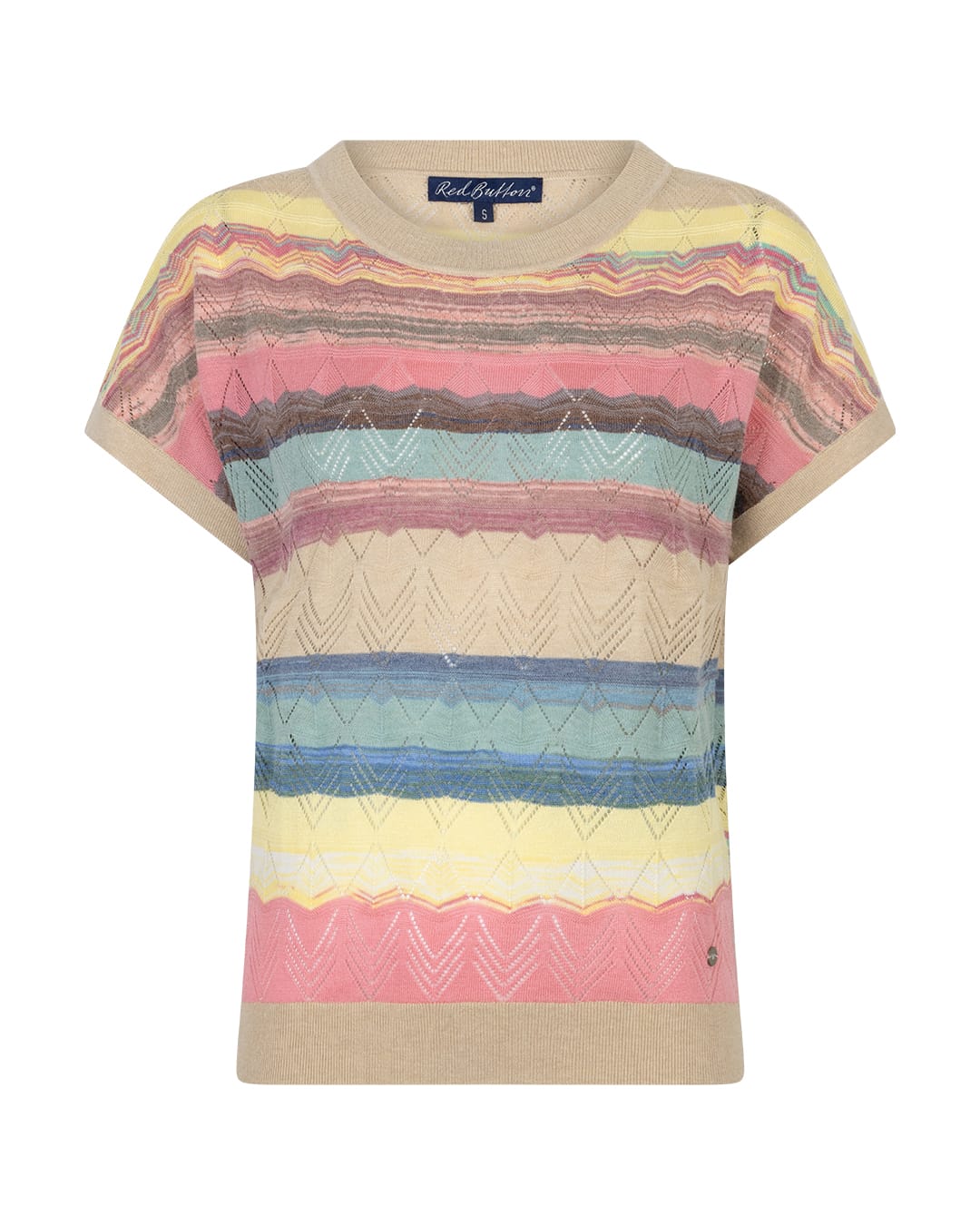 Ajourgebreide multicolor trui van Red Button met korte aangeknipte mouwen, ronde hals en ribgebreide boorden.