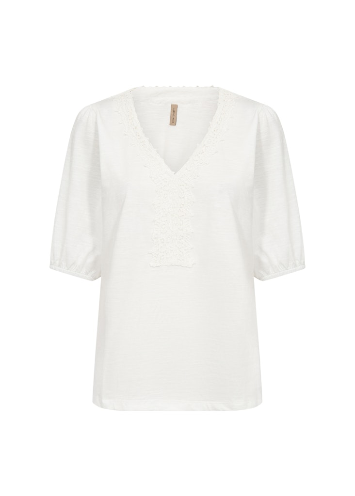 Shirt van Soya Concept met korte pofmouwen en een V-hals afgewerkt met kant. Materiaal: Katoen 100%