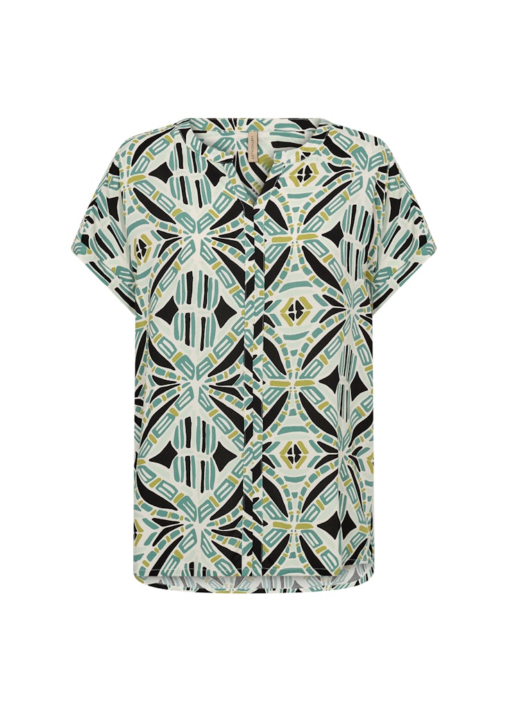 Blouse van Soya Concept in een all-over dessin met korte aangeknipte mouwen voorzien van omslag en een ronde hals voorzien van V-inkeping.