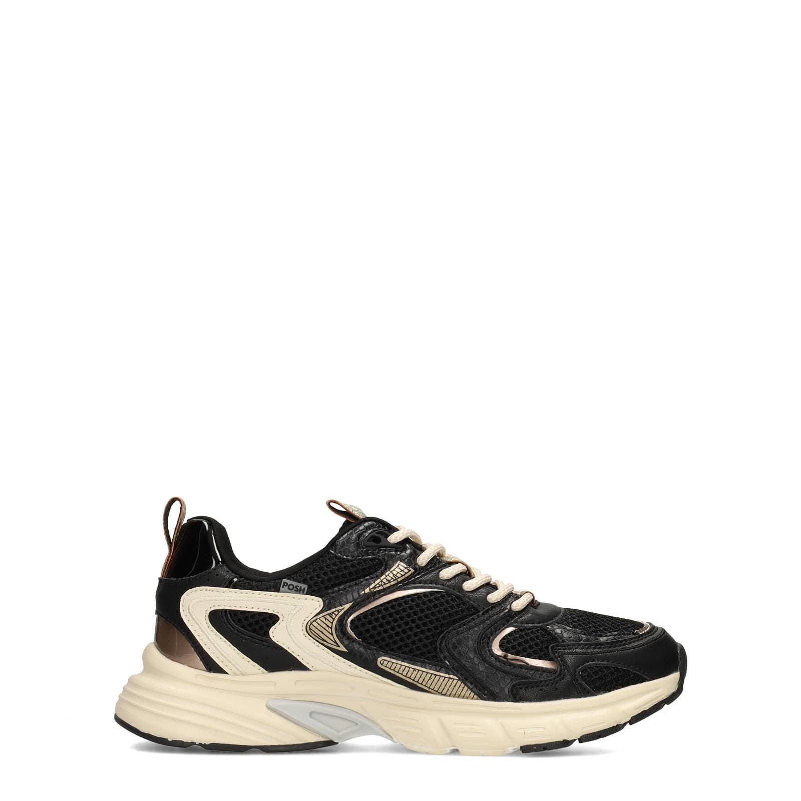 De LOLA sneaker van POSH by Poelman combineert sportieve vibes met een trendy uitstraling. Gemaakt van zwart imitatieleer en ademend mesh, met beige en metallic accenten. De 4 cm chunky zool geeft extra comfort en een moderne touch.