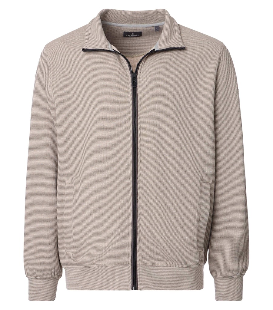 Vest van Casa Moda in een licht structuur dessin met lange mouwen, ritssluiting, kraag, steekzakken, logo op de linkermouw en elastische boorden.