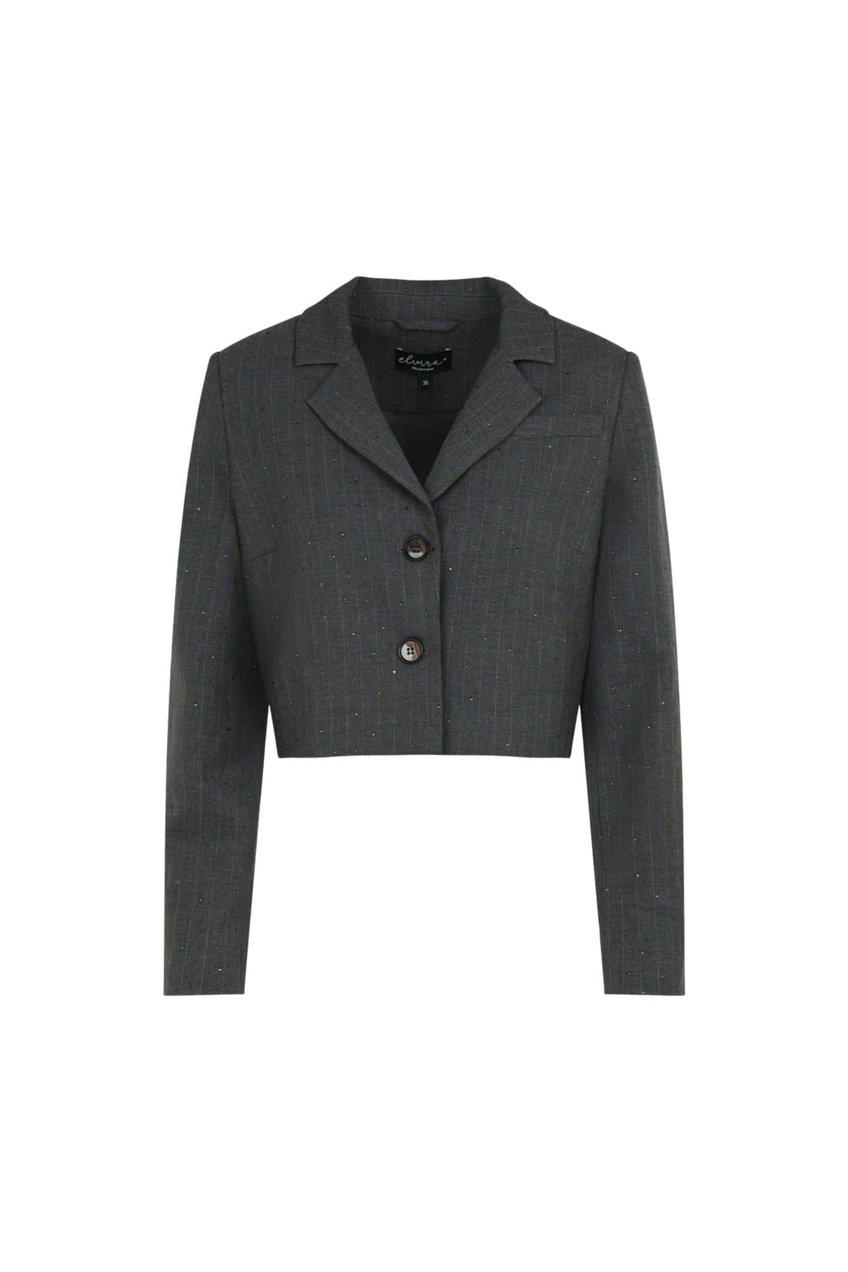 Korte krijtstreep blazer van Elvira voorzien van subtiele steentjes met lange mouwen, reverskraag en een papselzak op de linkerborst. Materiaal: Polyester 62%| viscose 33%| elastan 5%