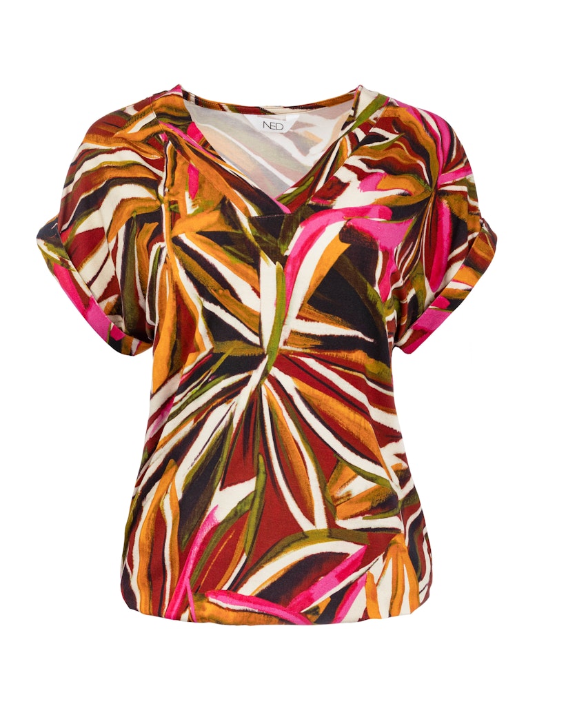 Shirt van N.E.D. in een all-over dessin met een V-hals, korte aangeknipte mouwen voorzien van omslag en een elastische zoom.