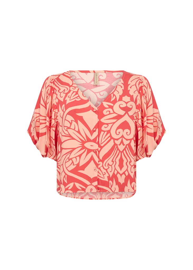Blouse van Soya Concept in een all-over dessin met korte wijde mouwen, V-hals en knoopsluiting.