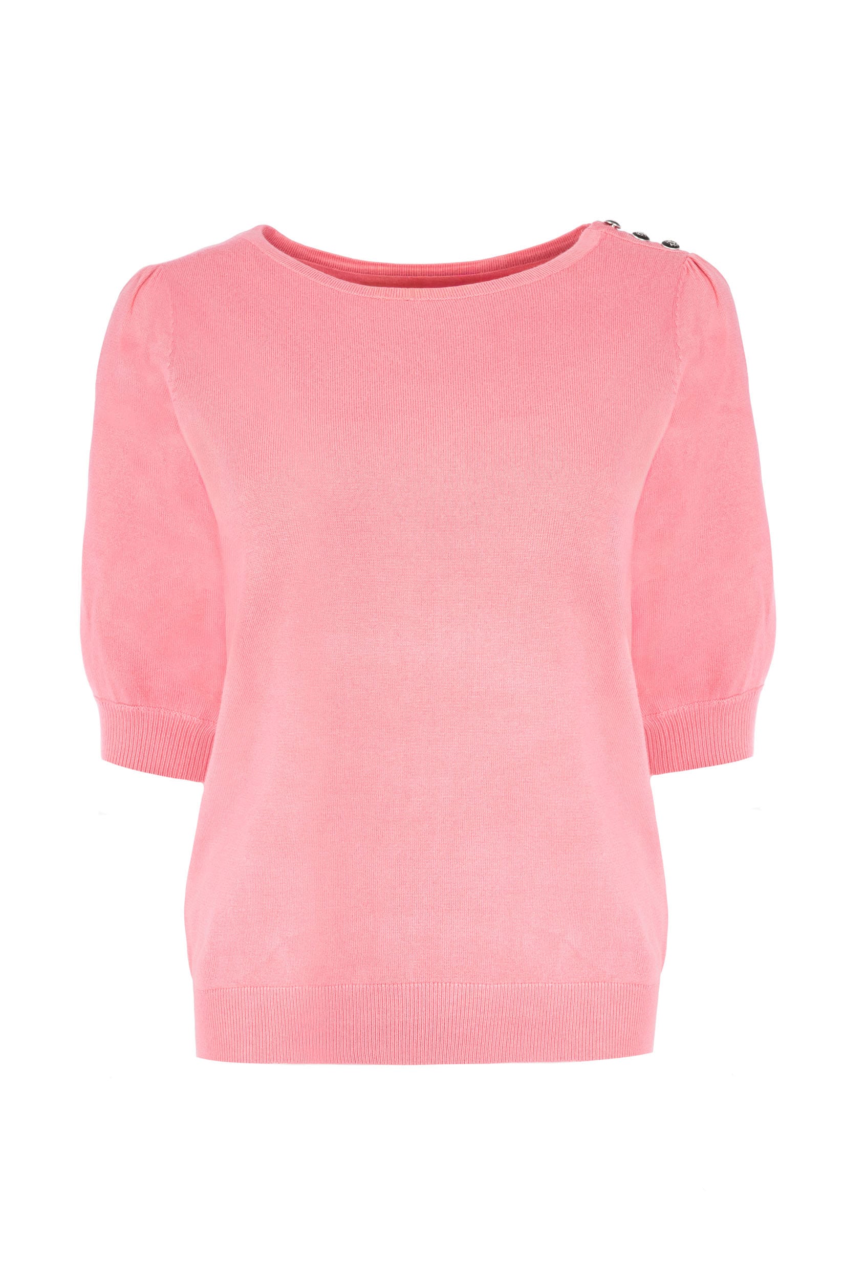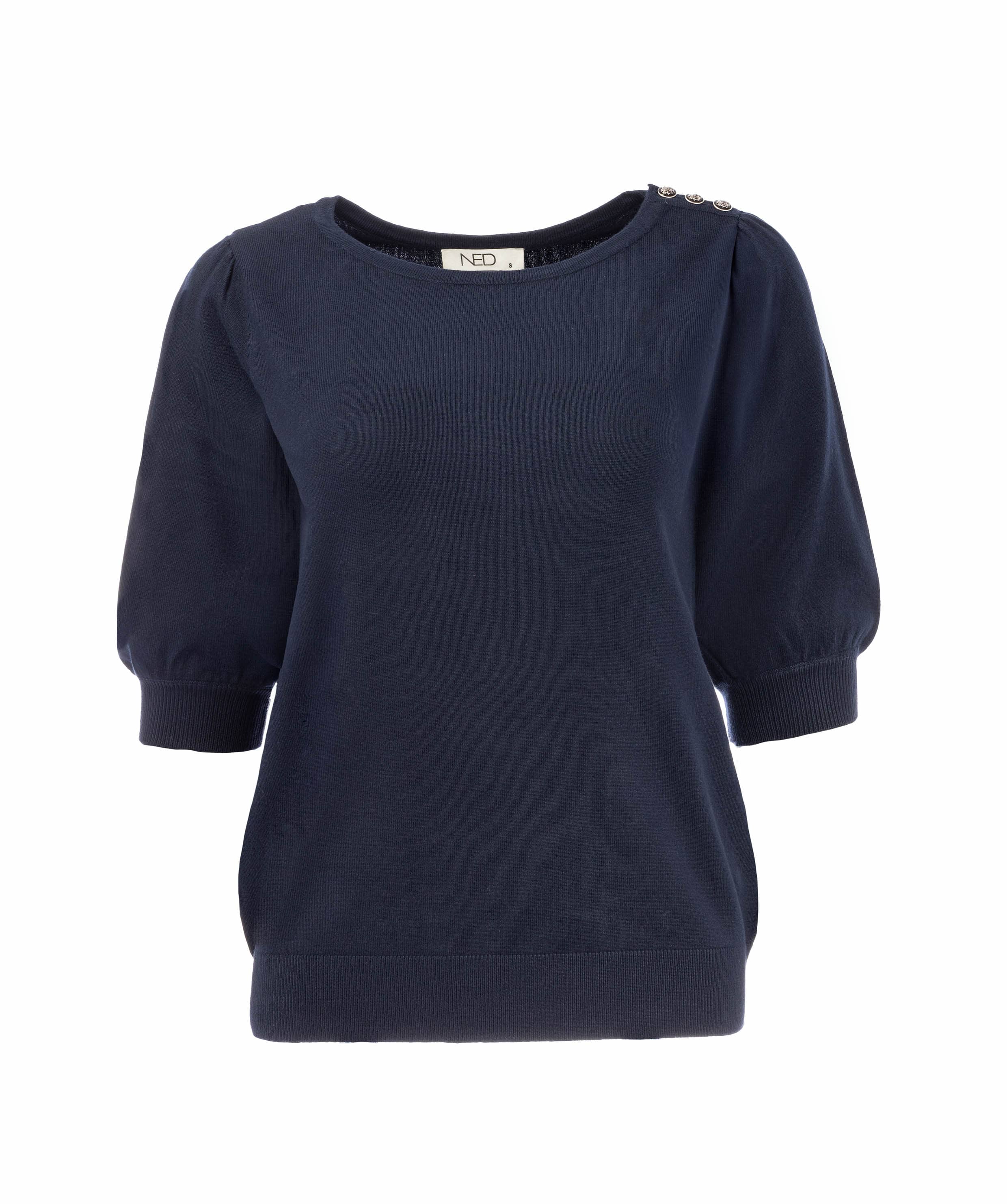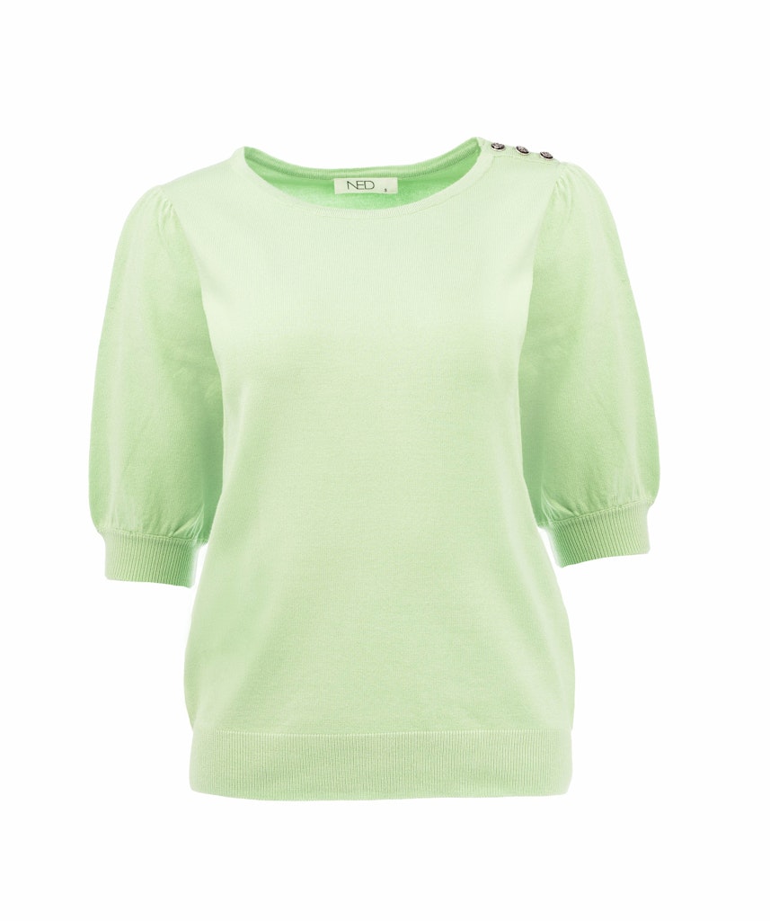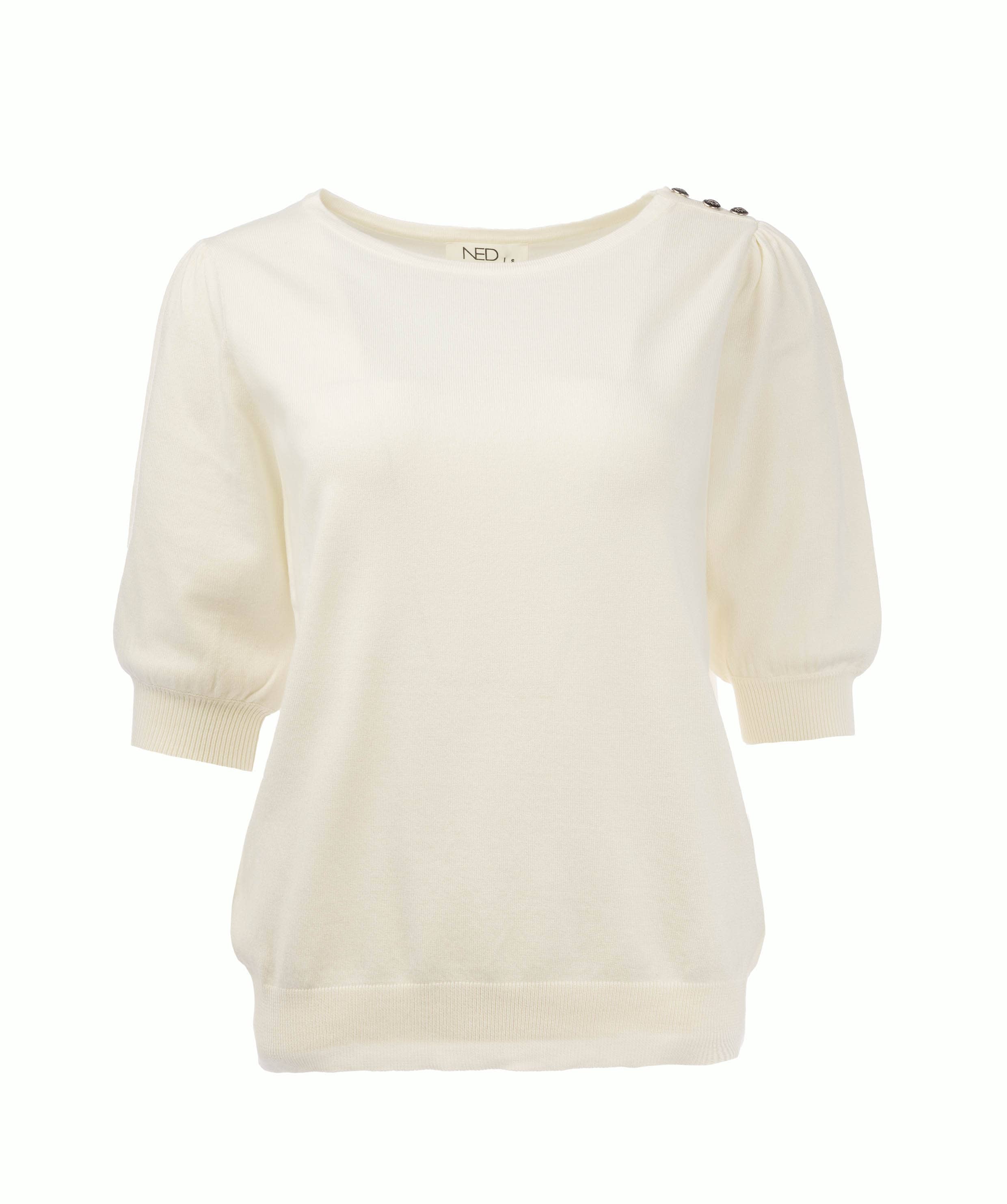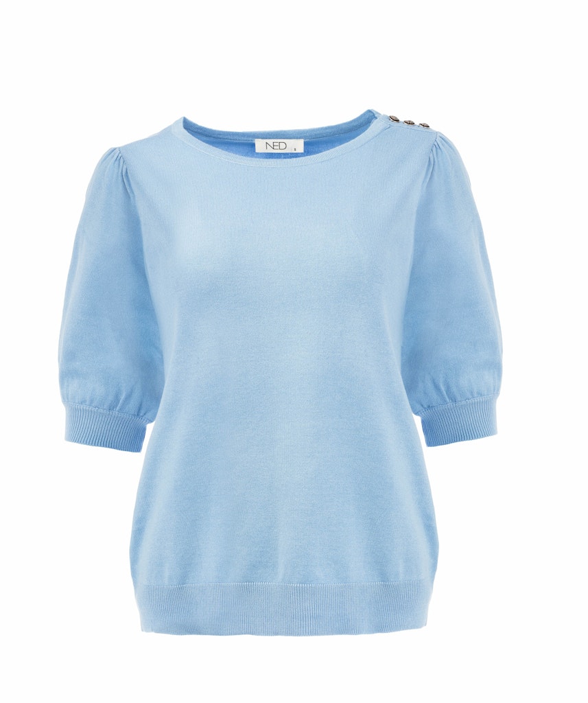 Trui van N.E.D. met korte pofmouwen, ronde hals, knoopdetail op de linkerschouder en ribgebreide boorden.