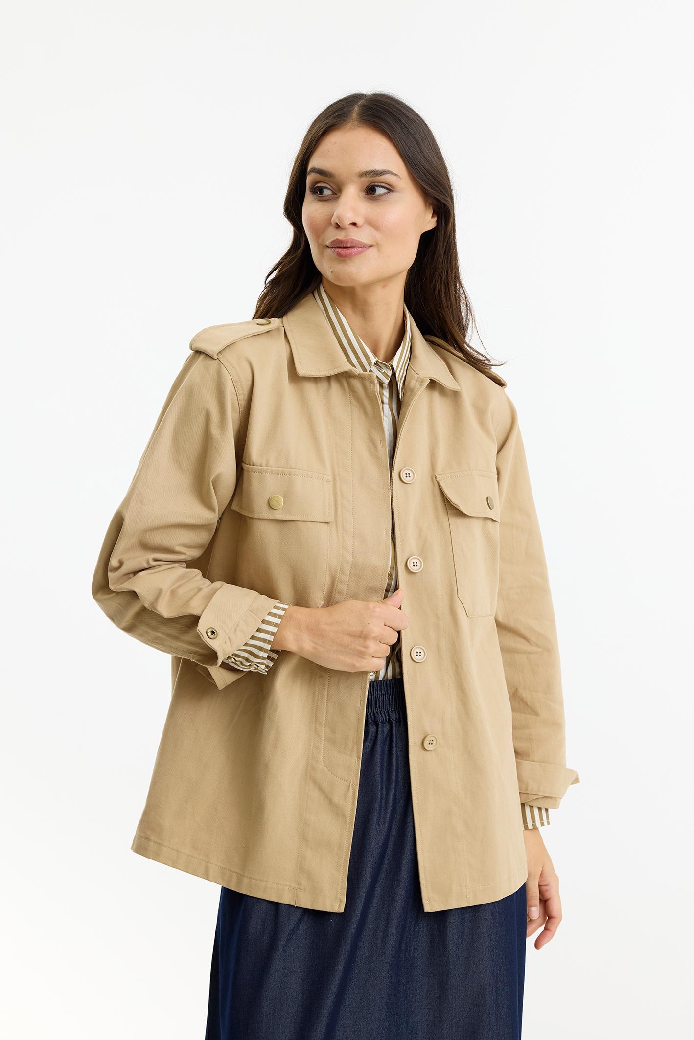 Jacket van In Front met lange mouwen, kraag, knoopsluiting, twee klepzakken op de borst, epauletten op de schouders en een geborduurde print aan de achterzijde.