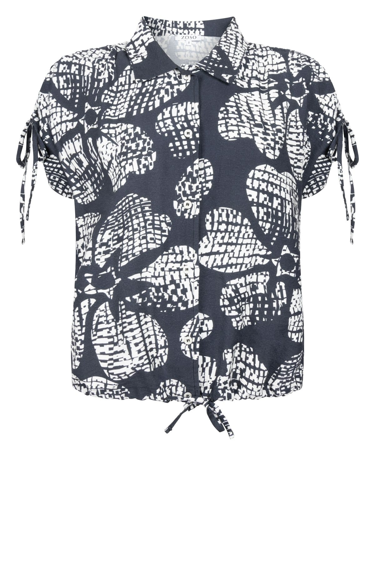 Blouse van Zoso in een all-over dessin met korte aangeknipte mouwen voorzien van strikkoord, kraag, knoopsluiting en een strikkoord in de zoom. Materiaal: Viscose 95%| elastan 5%