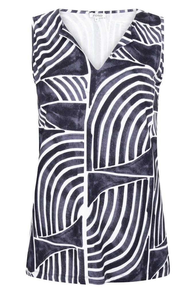 Mouwloze top van Zoso in een grafisch dessin met een openvallende V-hals. Materiaaal: Viscose 95%| elastan 5%