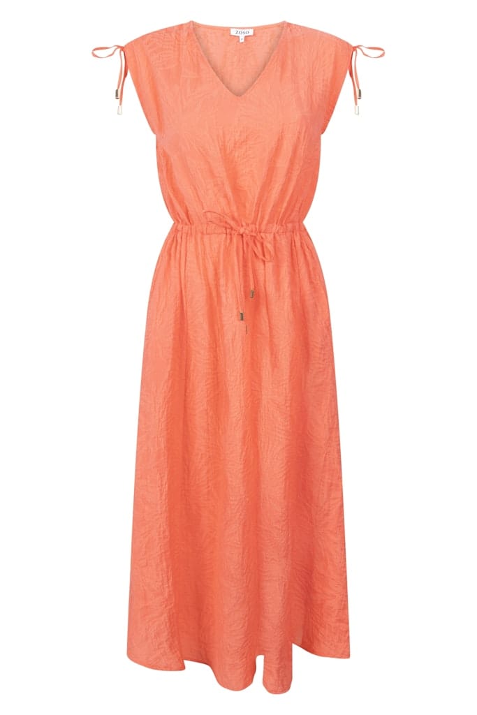 Jurk van Zoso in een structuur dessin met korte aangeknipte mouwen voorzien van strikkoord, V-hals en een strikceintuur in de taille.