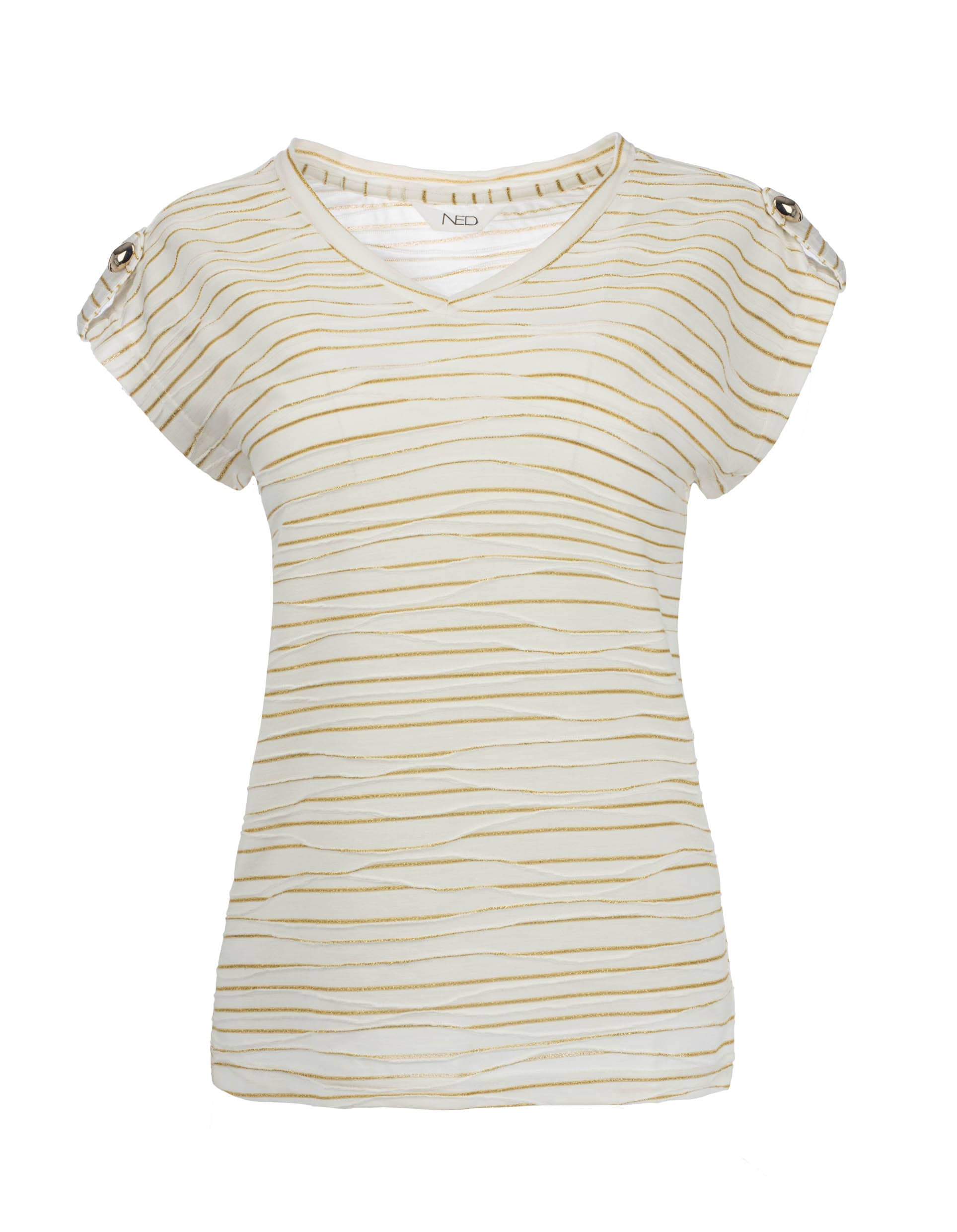 Lurex gestreept shirt van N.E.D. met korte mouwen voorzien van gesp en een V-hals. Materiaal: Rayon 95%| metallic 5%