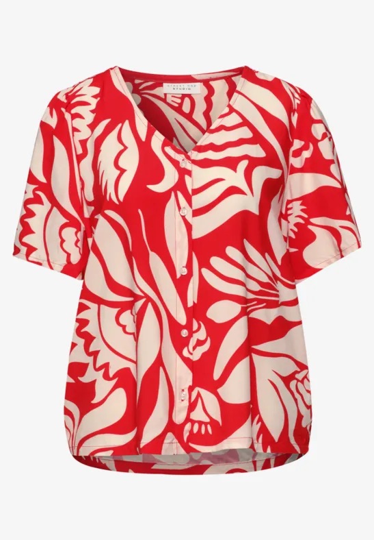 Blouse van Street One Studio in een bloemen dessin met een V-hals, knoopsluiting en korte mouwen voorzien van plooien aan de schouders.