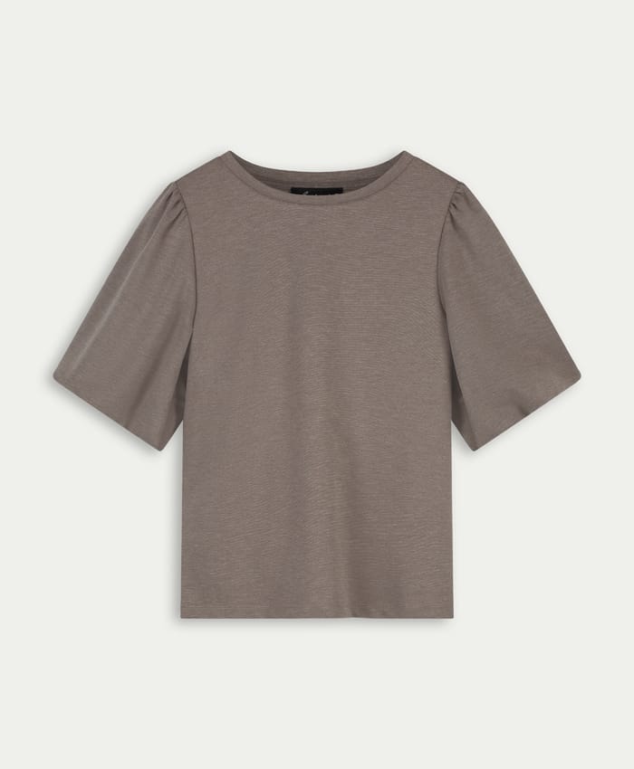 Trui van Elvira met korte mouwen, subtiele plooien op de schouders en ronde hals. Materiaal: Viscose 61%| polyester 36%| elastan 3%