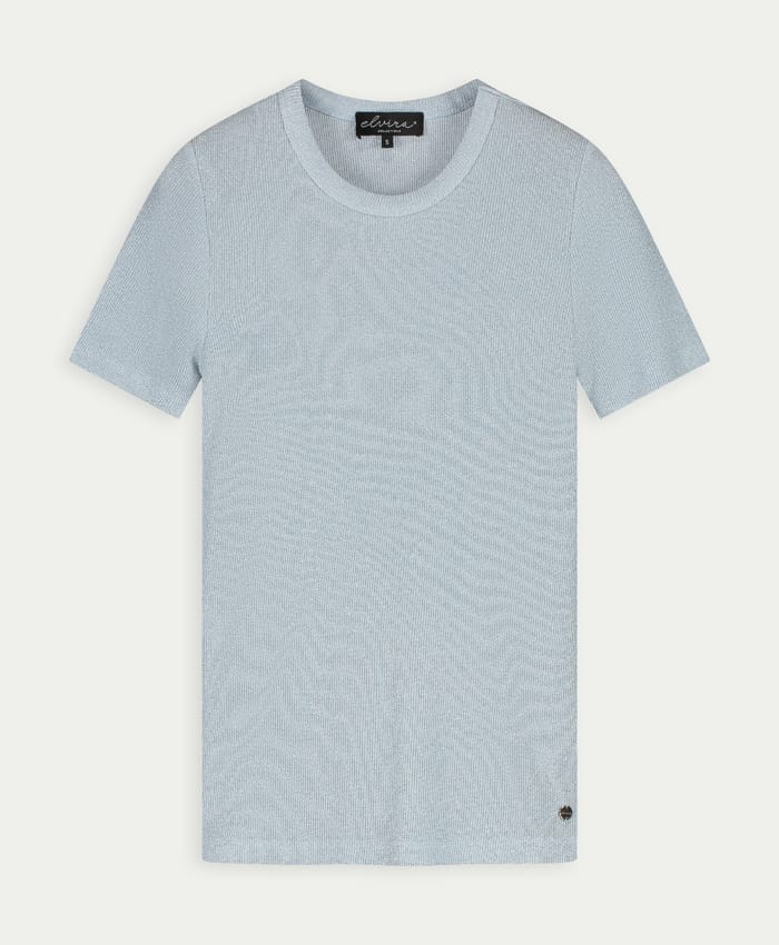 Shirt van Elvira in een fijne ribstructuur met een subtiele glitter, korte mouwen en ronde hals. Materiaal: Viscose 87%| metallic 13%