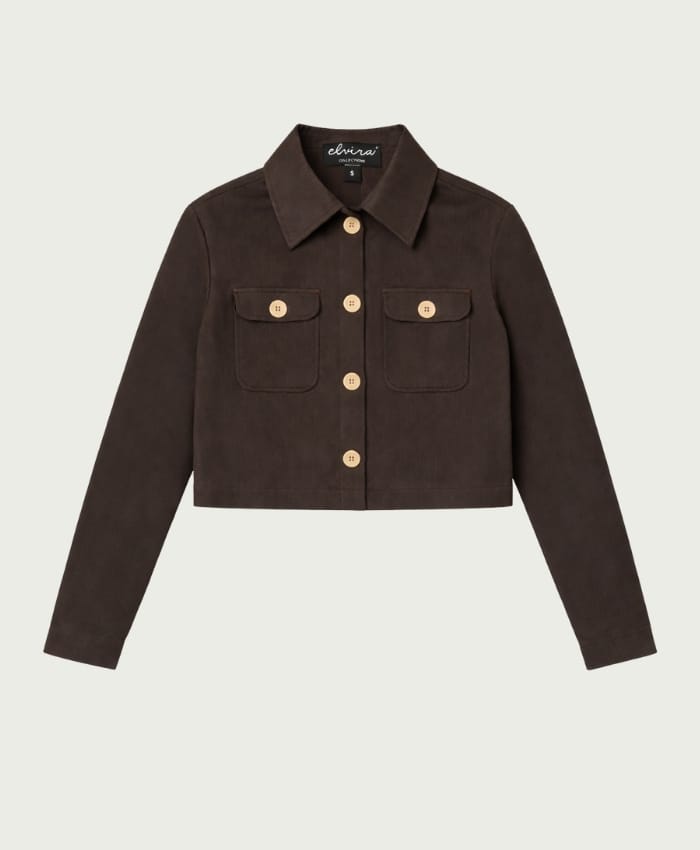 Korte blazer van Elvira met lange mouwen, kraag, knoopsluiting en klepzakken op de borst.