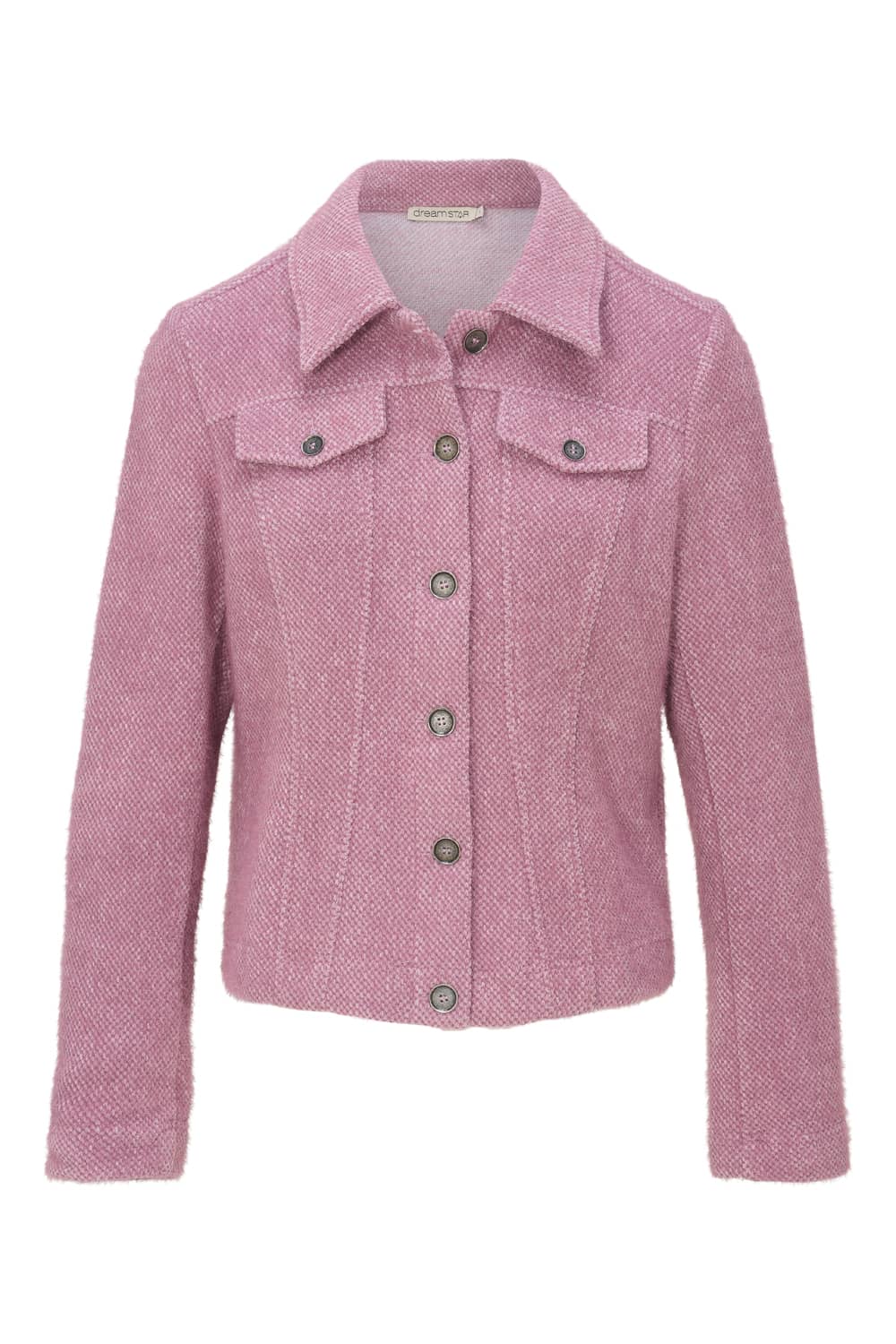 Jacket van Dreamstar in een licht structuur dessin met lange mouwen, kraag, knoopsluiting en twee klepzakken op de borst.