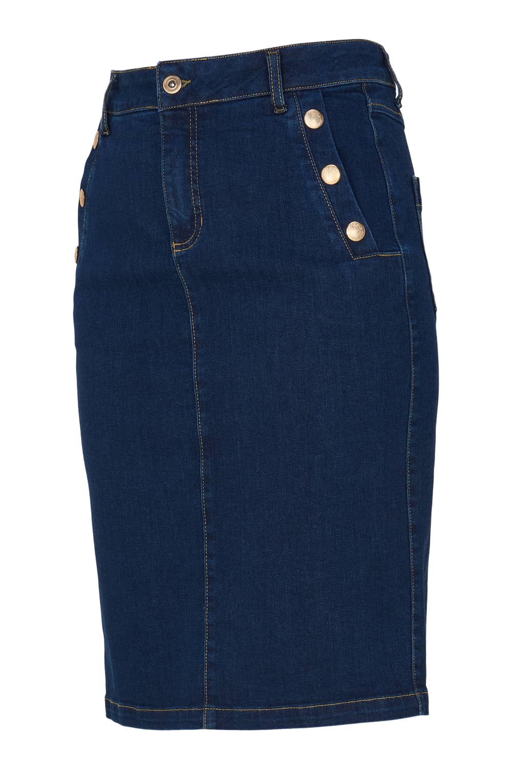 Rechte denim rok van Dreamstar met een knoop- en ritssluiting, twee steekzakken voorzien van drukknopen en opgestikte achterzakken.