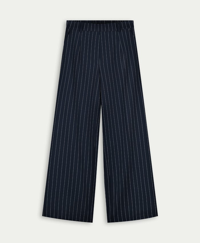 Krijtstreep broek van Elvira met wijde pijpen, bandplooien, steekzakken, twee paspelzakken en een elastische tailleband aan de achterzijde.