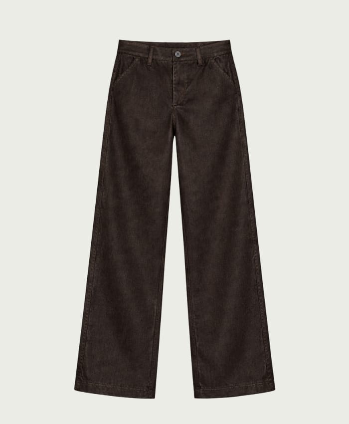 Broek van Elvira met wijde pijpen, knoop- en ritssluiting en steekzakken. Materiaal: Katoen 66%| polyester 32%| elastan 2%
