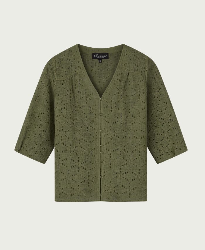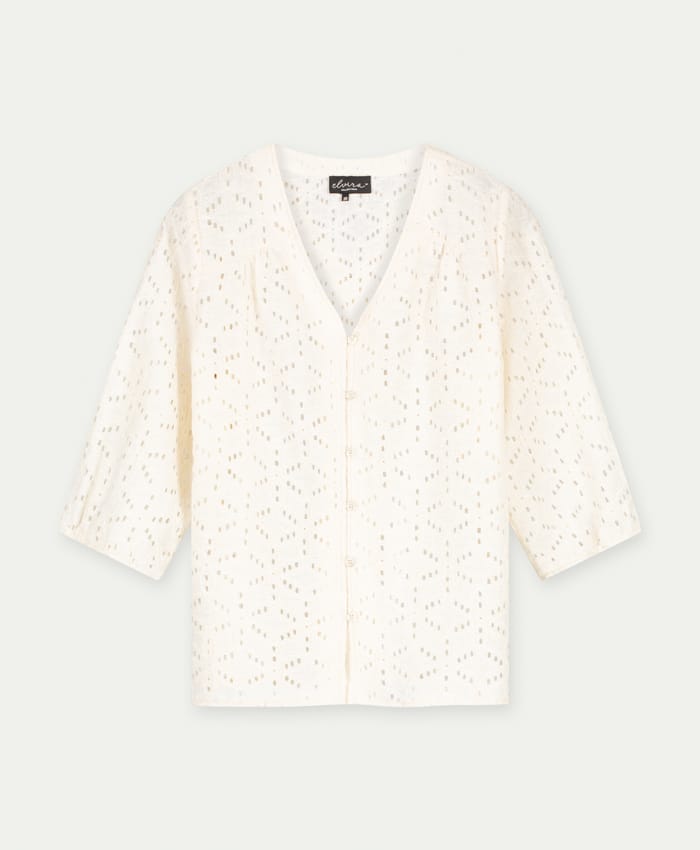 Broderie blouse van Elvira met driekwart mouwen, V-hals en een knoopsluiting. Materiaal: Katoen 70%| polyester 30%