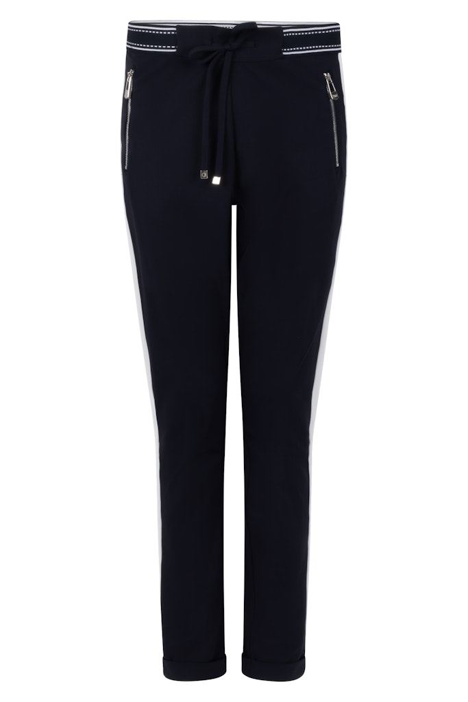 Broek van ZOSO in travel kwaliteit met een elastische tailleband voorzien van trekkoord, contrasterende bies aan de zijkanten, ritszakken, klepzakken aan de achterzijde en omslag onderaan de pijpen.