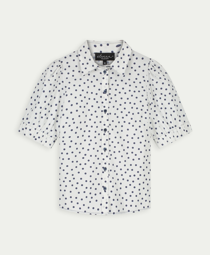 Blouse van Elvira in een stippen dessin met korte pofmouwen, kraag en een knoopsluiting.