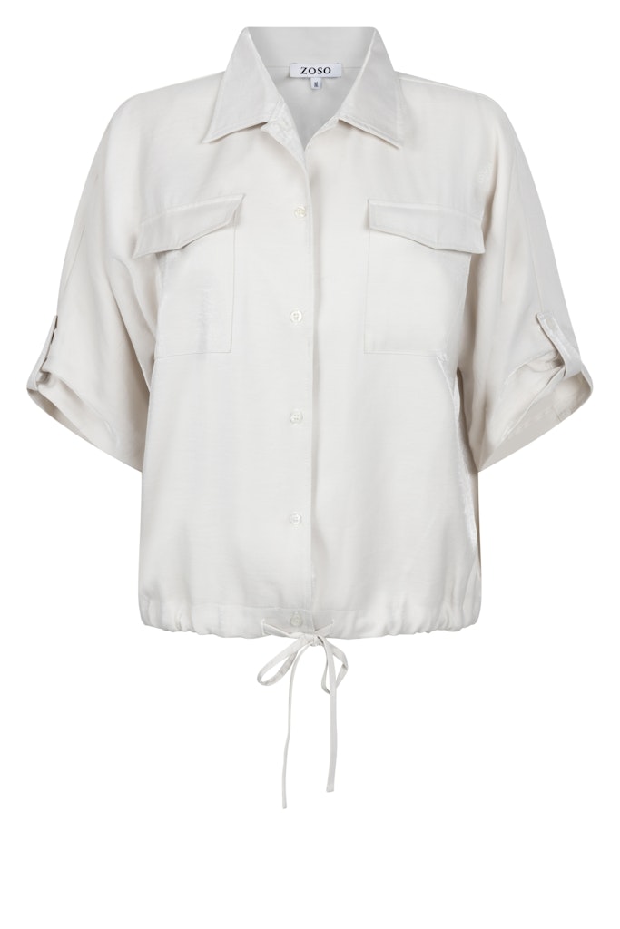 Blouse van Zoso met driekwart hold-up mouwen, kraag, knoopsluiting, twee opgestikte klepzakken en een trekkoord in de taille. Materiaal: Viscose 87%| polyester 13%