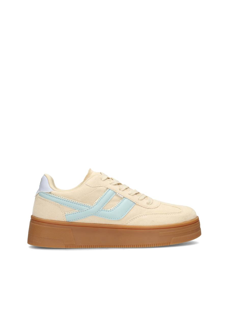 Classic met een twist. De GEORGIA sneaker van POSH by Poelman tilt jouw look naar een hoger niveau met een chunky gumzool en frisse lichtblauwe details. Gemaakt van beige imitatiesuède met een retro vibe en comfortabele pasvorm. De 4 cm zool en het uitneembare voetbed zorgen voor stijl én support.