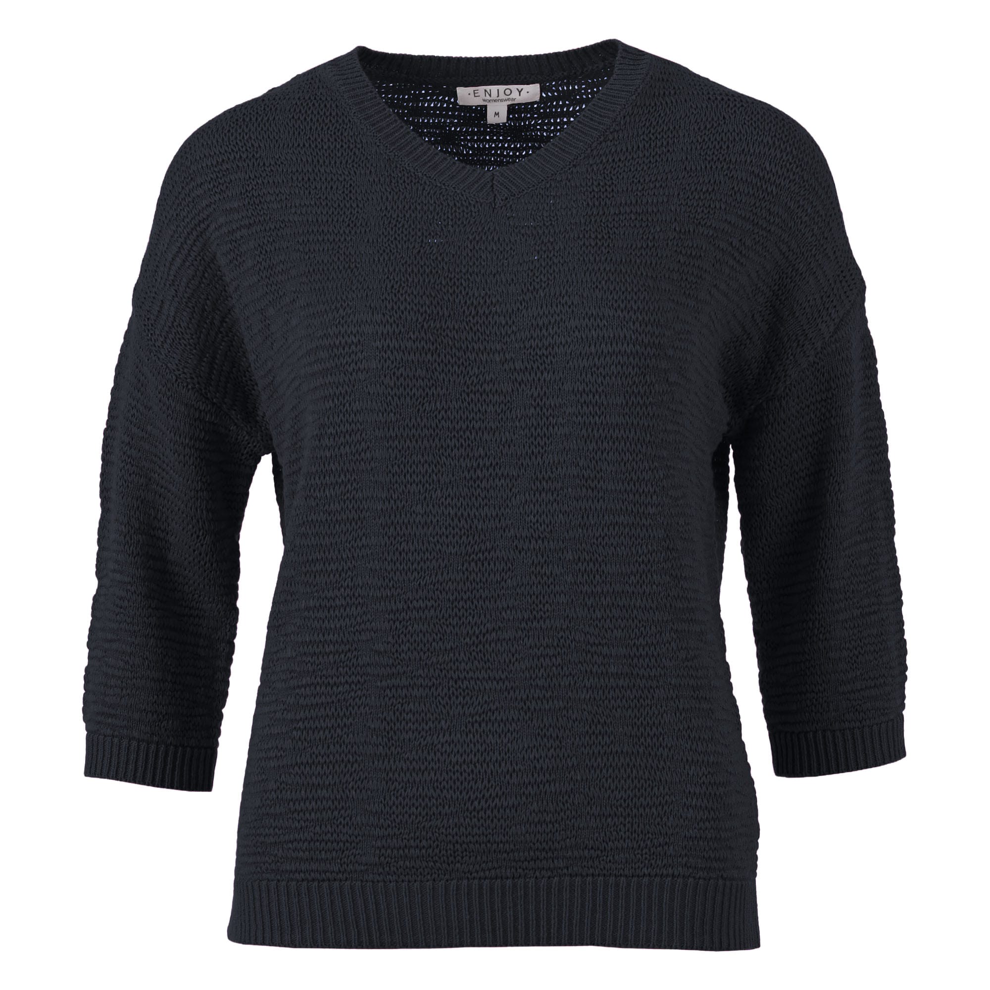 Trui van Enjoy in een subtiel structuur dessin met driekwart mouwen, V-hals en ribgebreide boorden. Materiaal: Acryl 100%