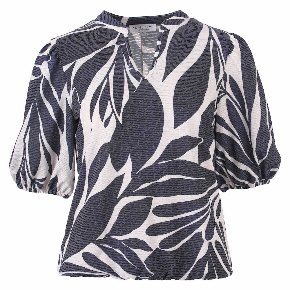 Blouson van Enjoy in een all-over dessin met halflange pofmouwen, opstaande kraag, V-hals en een elastische zoom. Materiaal: Polyester 97%| elastan 3%