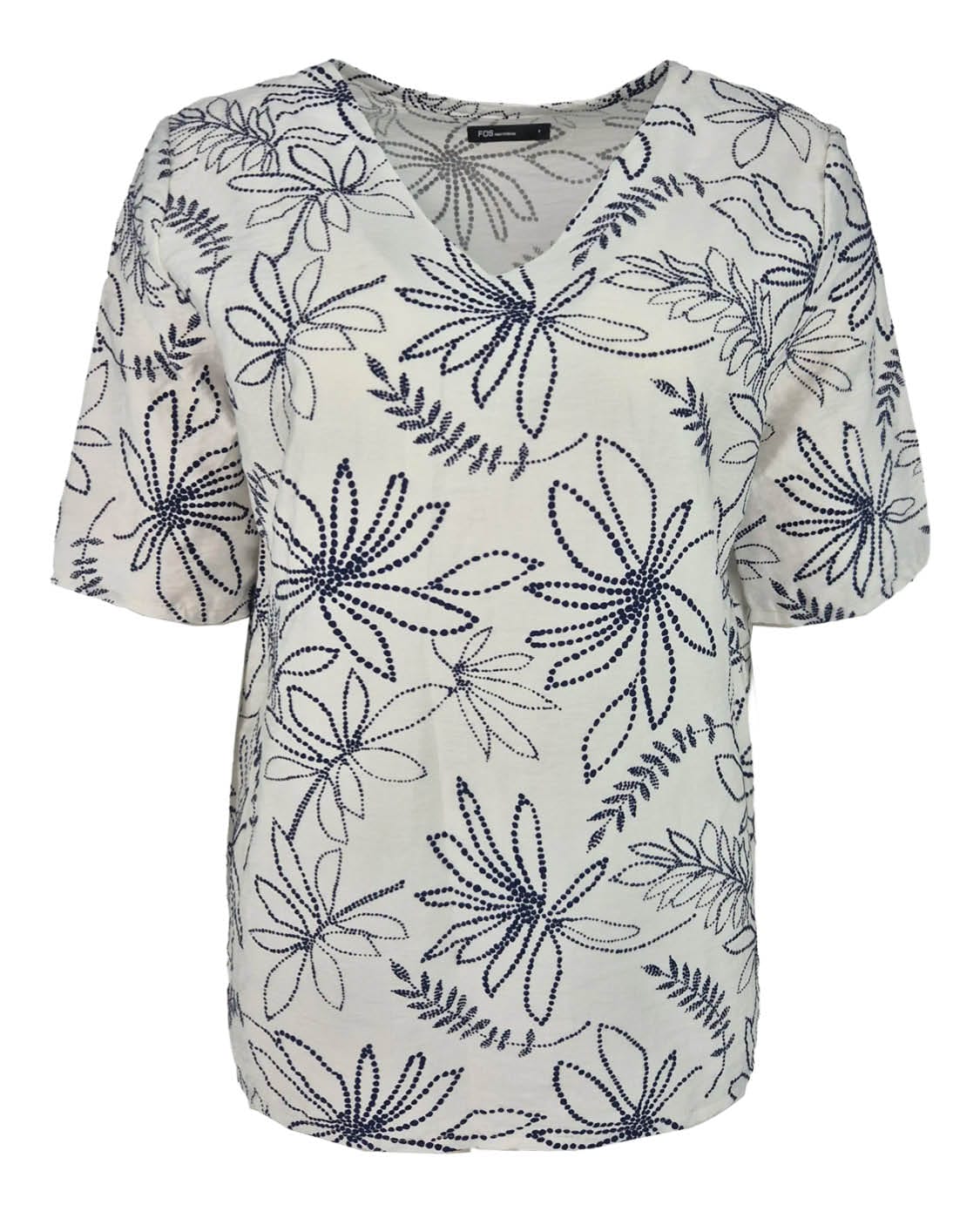 Blouson van FOS Amsterdam in bloemendessin met korte mouwen, V-hals en elastische onderzijde. Materiaal: Viscose 85%| nylon 15%