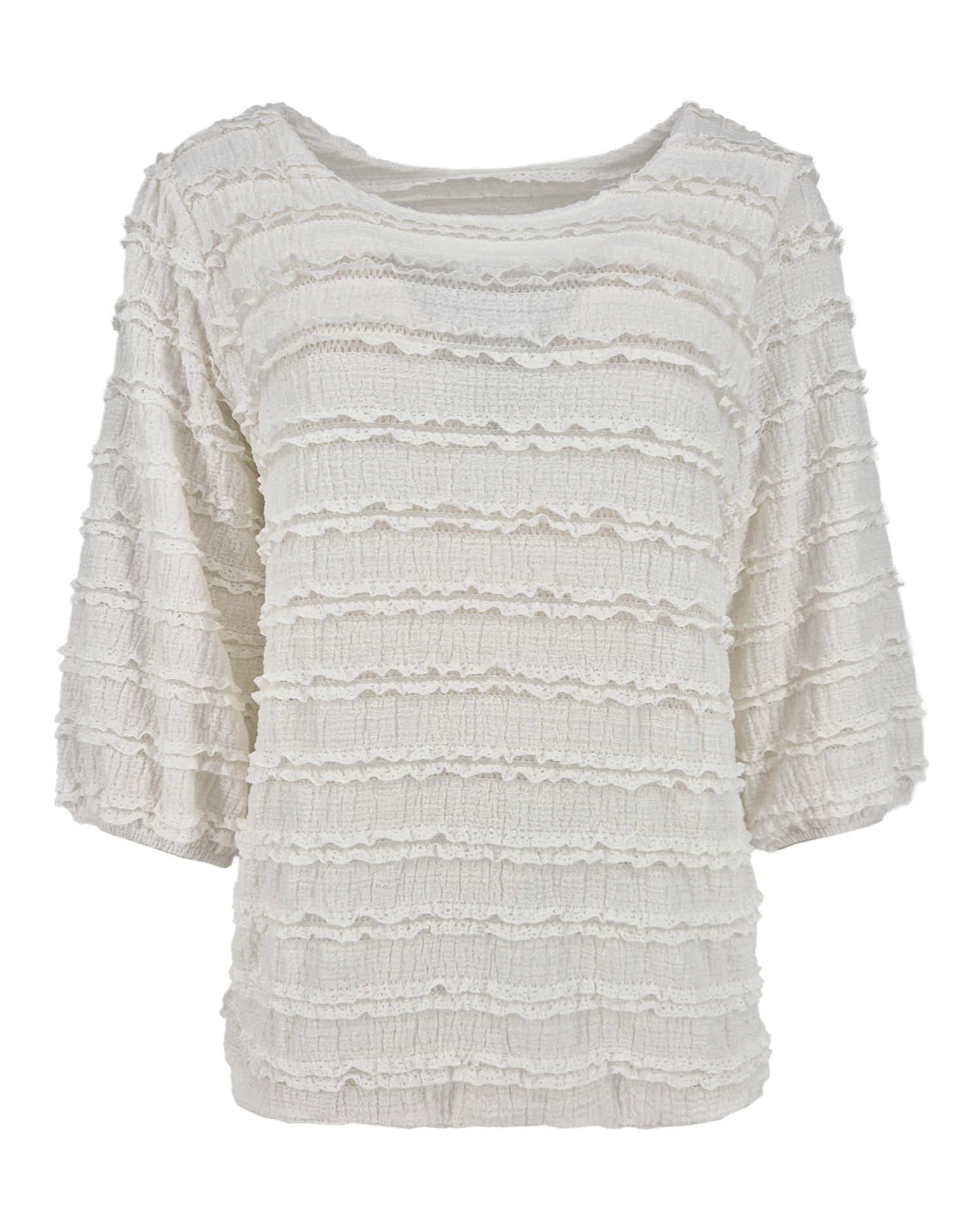 Top van FOS Amsterdam in een stretchy structuurstof met kanten ruffles, driekwart mouwen, wijde ronde hals en elastische boorden.