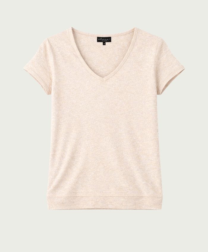Licht glanzend T-shirt van Elvira met korte mouwen, V-hals en een boord aan de onderzijde. Materiaal: Viscose 85%| lurex 15%