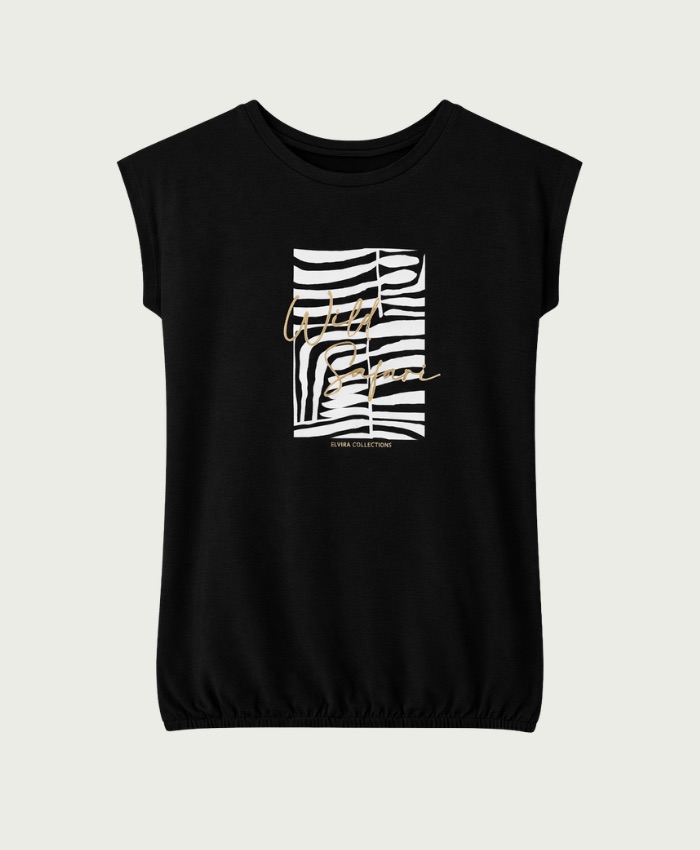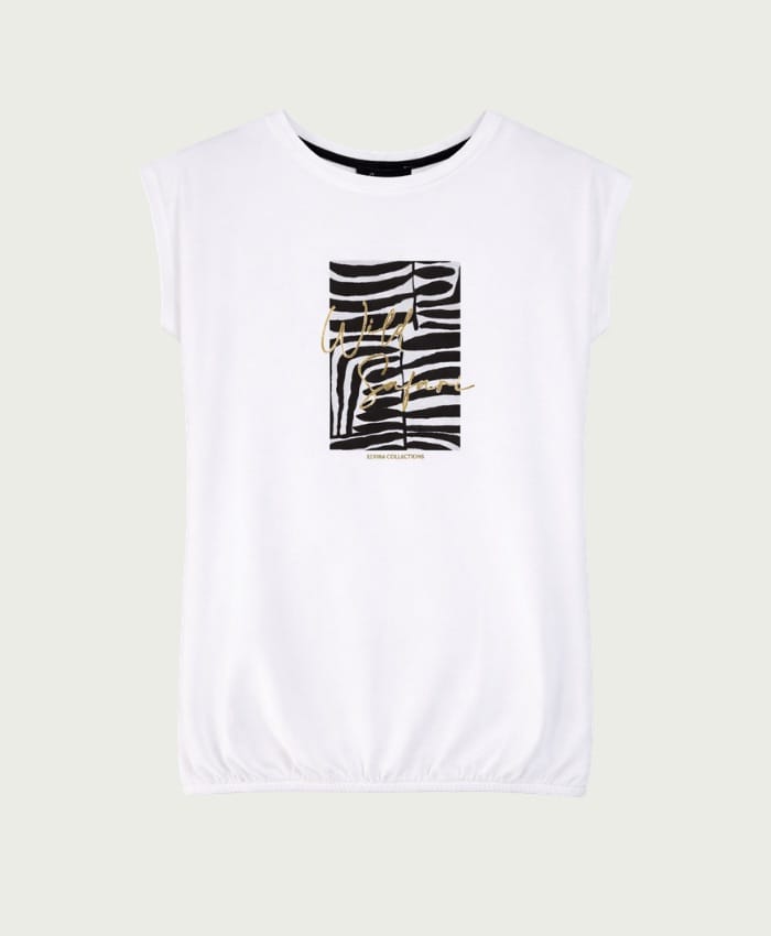 T-shirt van Elvira met korte aangeknipte mouwen, ronde hals, safariprint op de borst en een elastische zoom.