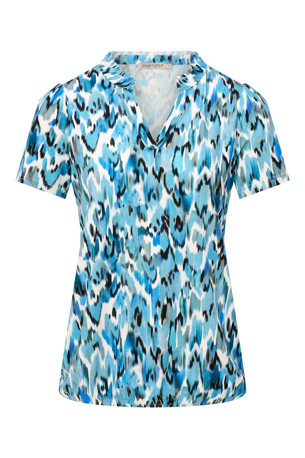 Top van Dreamstar in een all-over dessin met korte mouwen, V-hals voorzien van opstaand kraagje en een elastische tailleband.