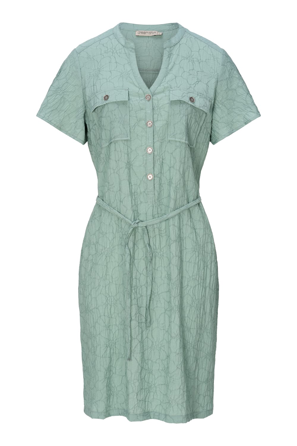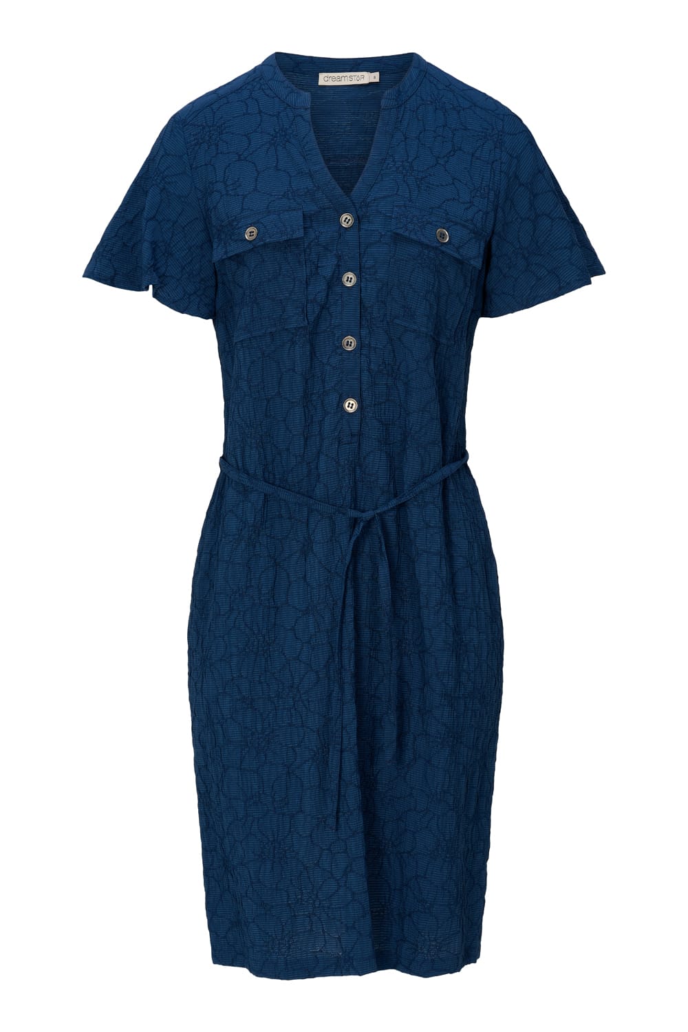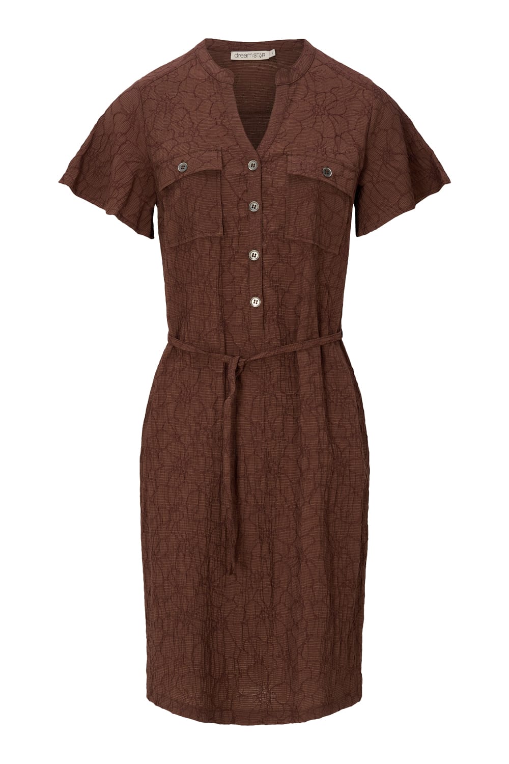 Jurk van Dreamstar in een structuur dessin met korte mouwen, V-hals, knoopsluiting tot aan de taille, klepzakken op de borst en strikkoord in de taille. Materiaal: Viscose 72%| polyamide 25%| elastan 3%