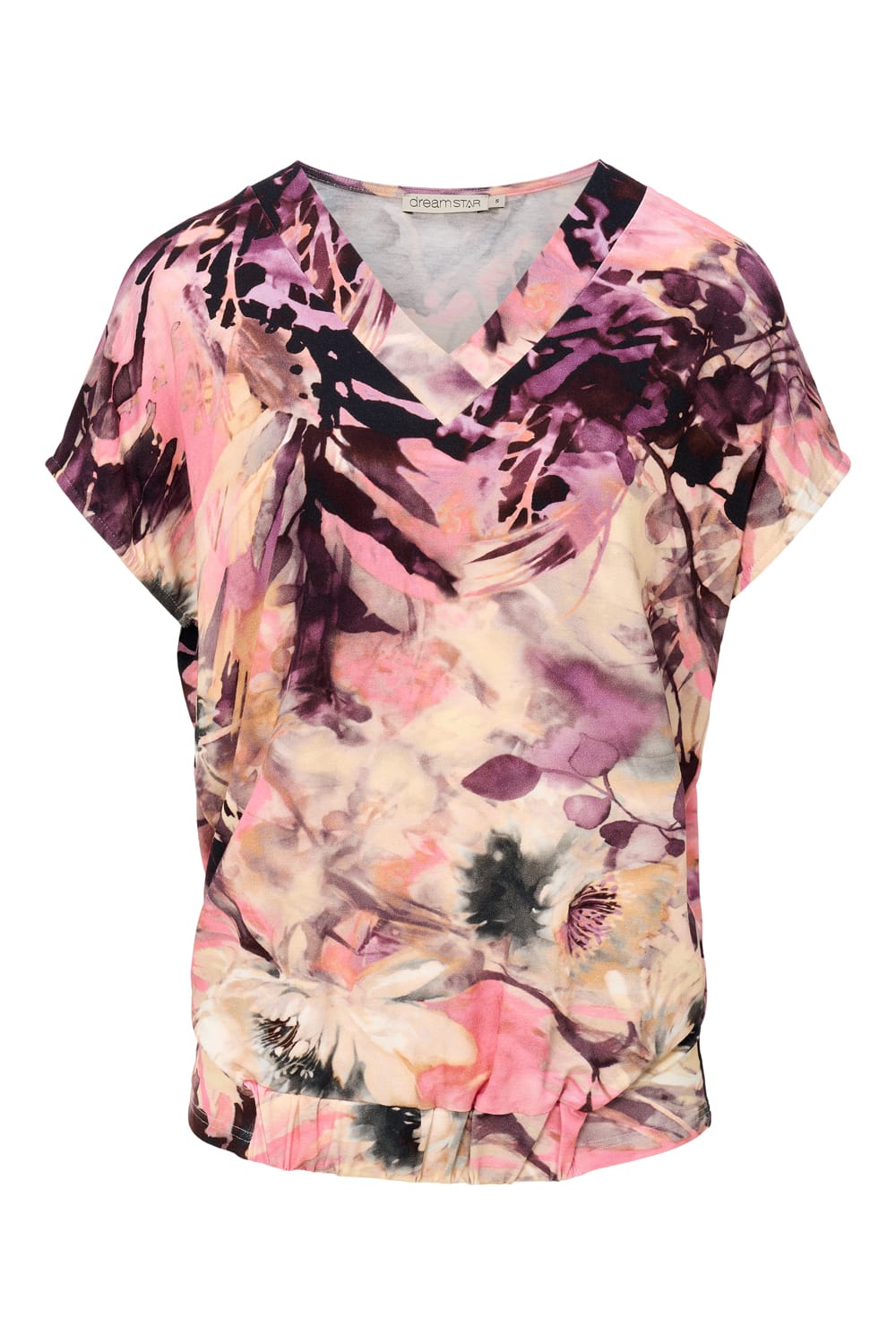 Top van Dreamstar in een all-over dessin met korte mouwen, V-hals en een elastische tailleband. Materiaal: Viscose 95%| elastan 5%