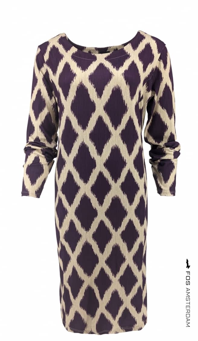 Jurk van Fos Amsterdam in een all-over dessin met lange mouwen en een ruime ronde hals. Materiaal: Viscose 60%| polyester 35%| elastan 5%