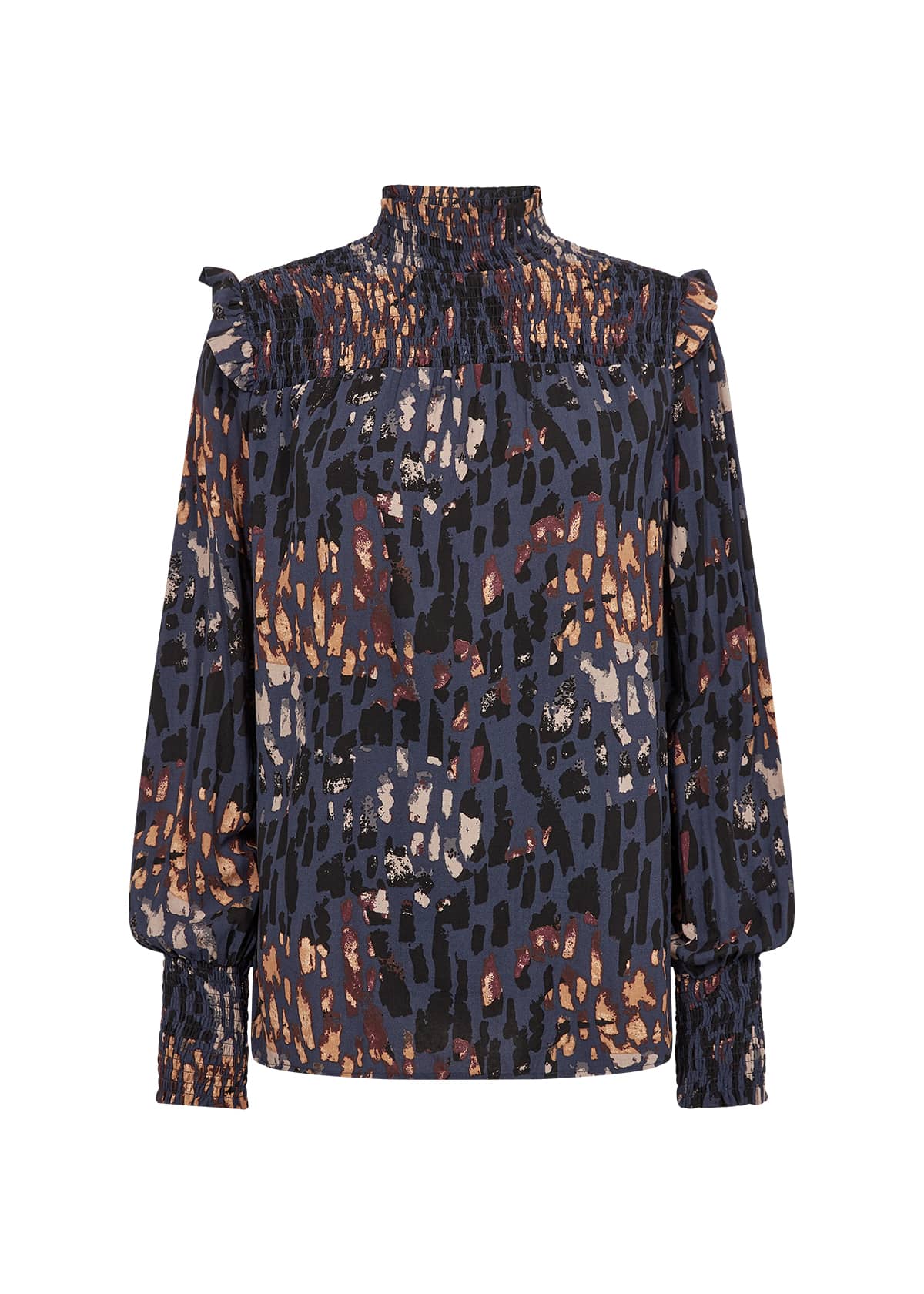 Blouse van Soya Concept in een all-over dessin met een gesmokte bovenzijde en opstaande kraag, ruches en lange pofmouwen voorzien van gesmokte manchetten.