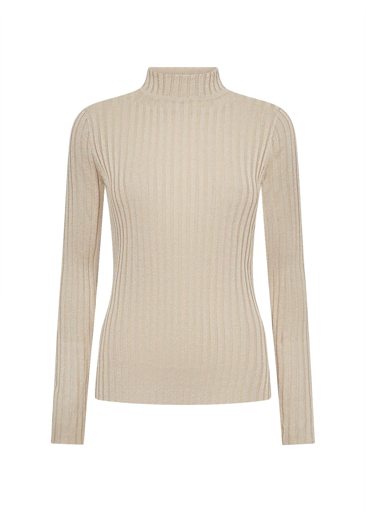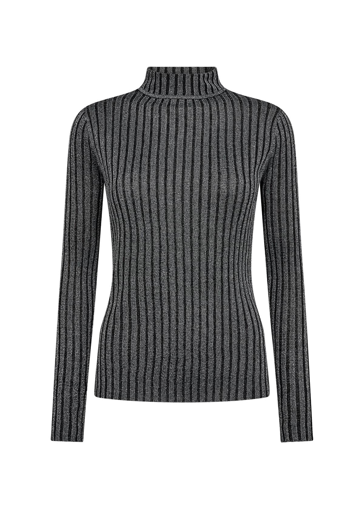 Lurex trui van Soya Concept in een ribstructuur met lange mouwen en een opstaande kraag. Materiaal: Eco viscose 86%| metallic 14%